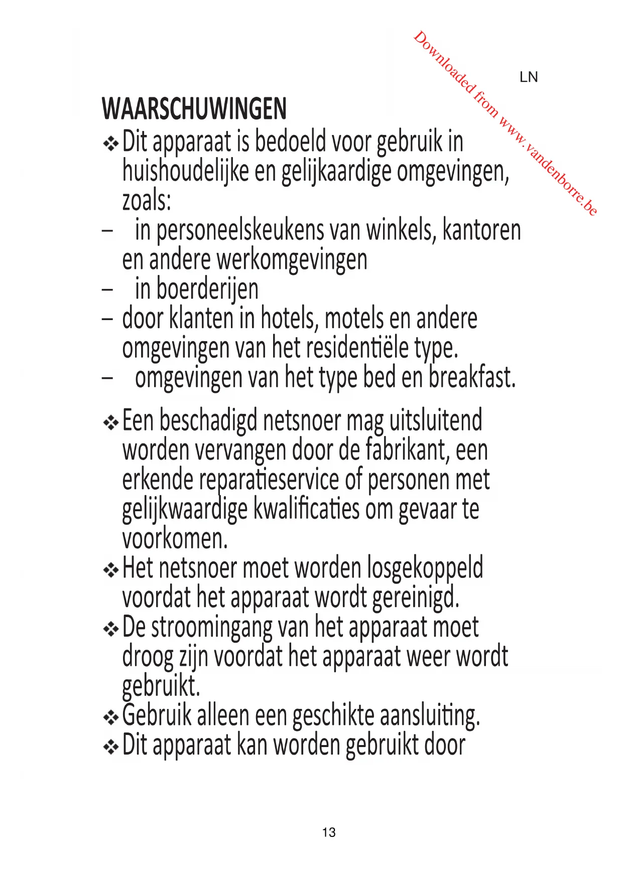 Downloaded from www.vandenborre.beLN WAARSCHUWINGEN Dit apparaat is bedoeld voor gebruik in huishoudelijke en gelijkaardige omgevingen, zoals: − in personeelskeukens van winkels, kantoren en andere werkomgevingen − in boerderijen − door klanten in hotels, motels en andere omgevingen van het residenële type. − omgevingen van het type bed en breakfast. Een beschadigd netsnoer mag uitsluitend worden vervangen door de fabrikant, een erkende reparaeservice of personen met gelijkwaardige kwalificaes om gevaar te voorkomen. Het netsnoer moet worden losgekoppeld voordat het apparaat wordt gereinigd. De stroomingang van het apparaat moet droog zijn voordat het apparaat weer wordt gebruikt. Gebruik alleen een geschikte aansluing. Dit apparaat kan worden gebruikt door
