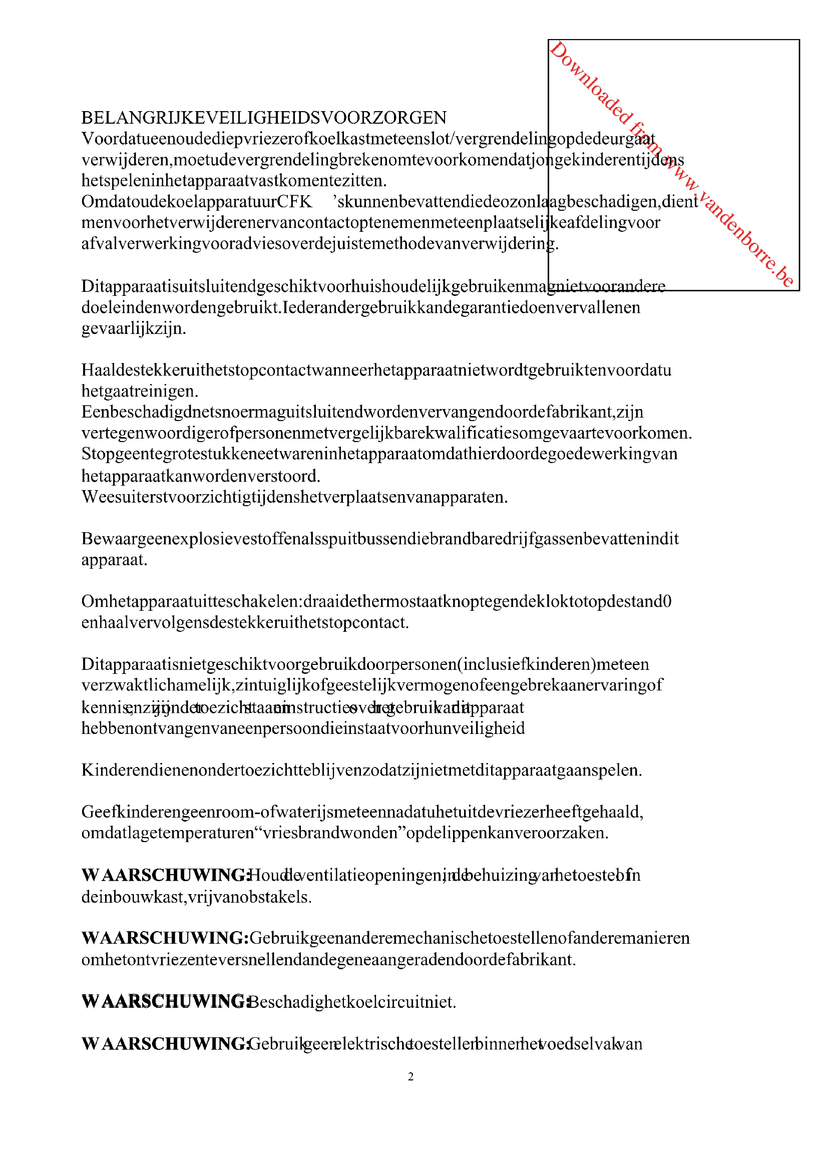 skunnenbevattendiedeozonlaagbeschadigen,dient menvoorhetverwijderenervancontactoptenemenmeteenplaatselijkeafdelingvoor afvalverwerkingvooradviesoverdejuistemethodevanverwijdering. Ditapparaatisuitsluitendgeschiktvoorhuishoudelijkgebruikenmagnietvoorandere doeleindenwordengebruikt.Iederandergebruikkandegarantiedoenvervallenen gevaarlijkzijn. Haaldestekkeruithetstopcontactwanneerhetapparaatnietwordtgebruiktenvoordatu hetgaatreinigen. Eenbeschadigdnetsnoermaguitsluitendwordenvervangendoordefabrikant,zijn vertegenwoordigerofpersonenmetvergelijkbarekwalificatiesomgevaartevoorkomen. Stopgeentegrotestukkeneetwareninhetapparaatomdathierdoordegoedewerkingvan hetapparaatkanwordenverstoord. Weesuiterstvoorzichtigtijdenshetverplaatsenvanapparaten. Bewaargeenexplosievestoffenalsspuitbussendiebrandbaredrijfgassenbevattenindit apparaat. Omhetapparaatuitteschakelen:draaidethermostaatknoptegendekloktotopdestand0 enhaalvervolgensdestekkeruithetstopcontact. Ditapparaatisnietgeschiktvoorgebruikdoorpersonen(inclusiefkinderen)meteen verzwaktlichamelijk,zintuiglijkofgeestelijkvermogenofeengebrekaanervaringof kennis,enzijzijondertoezichtstaaneninstructiesoverhetgebruikvanditapparaat hebbenontvangenvaneenpersoondieinstaatvoorhunveiligheid Kinderendienenondertoezichtteblijvenzodatzijnietmetditapparaatgaanspelen. Geefkinderengeenroom-ofwaterijsmeteennadatuhetuitdevriezerheeftgehaald, omdatlagetemperaturen“vriesbrandwonden”opdelippenkanveroorzaken. WAARSCHUWING: WAARSCHUWING: WAARSCHUWING: WAARSCHUWING:Houddeventilatieopeningen,indebehuizingvanhettoestelofin deinbouwkast,vrijvanobstakels. WAARSCHUWING: WAARSCHUWING: WAARSCHUWING: WAARSCHUWING:Gebruikgeenanderemechanischetoestellenofanderemanieren omhetontvriezenteversnellendandegeneaangeradendoordefabrikant. WAARSCHUWING: WAARSCHUWING: WAARSCHUWING: WAARSCHUWING:Beschadighetkoelcircuitniet. WAARSCHUWING: WAARSCHUWING: WAARSCHUWING: WAARSCHUWING:GebruikgeenelektrischetoestellenbinnenhetvoedselvakvanDownloaded from www.vandenborre.be