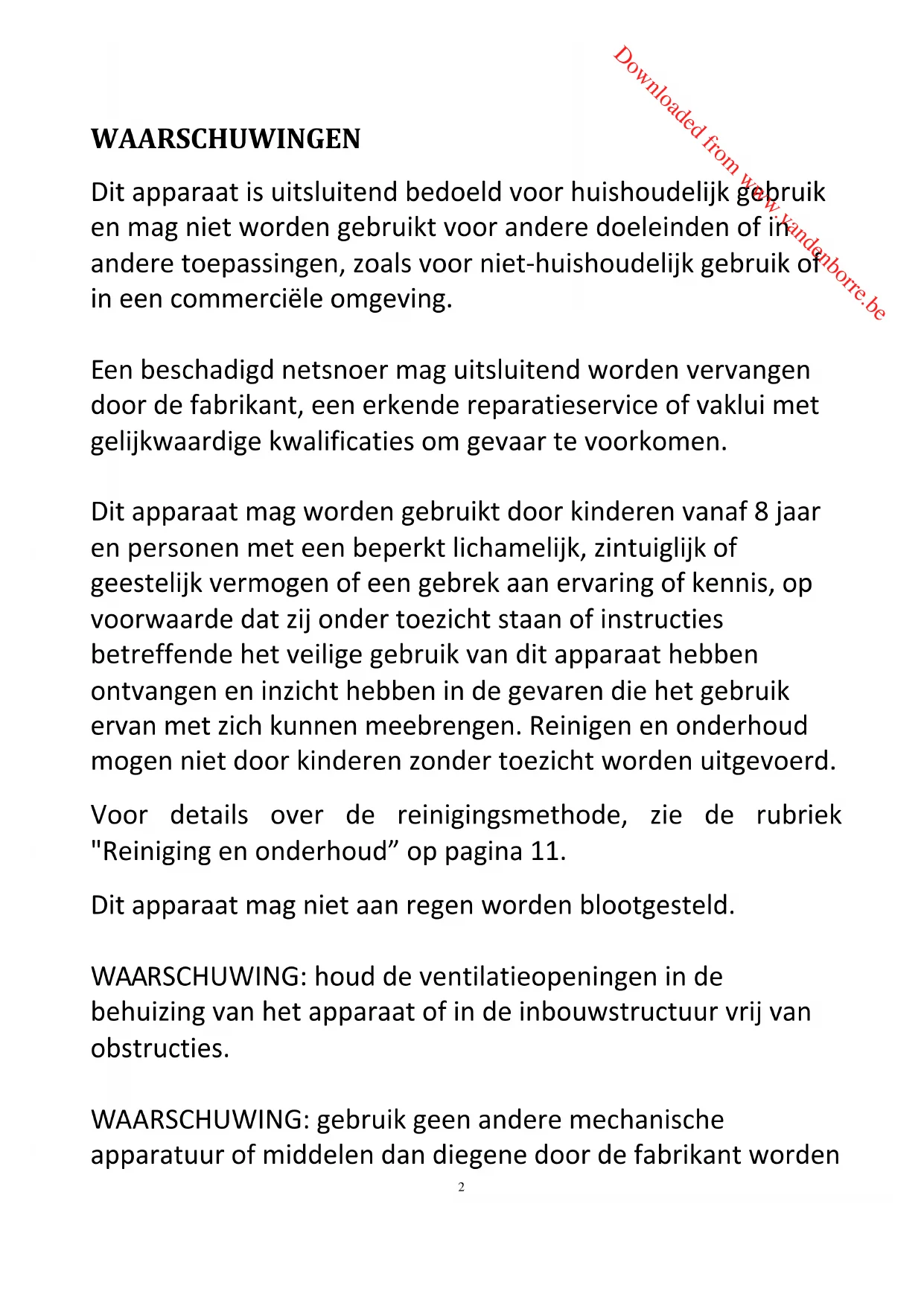 Downloaded from www.vandenborre.beafval te voorkomen, recycle het apparaat op een verantwoordelijke wijze, om het duurzame hergebruik van grondstoffen te bevorderen. Lever het apparaat in bij een inzamelpunt in uw gemeente. Installatie en onderhoud: Plaats het apparaat op een horizontaal oppervlak en zorg voor voldoende ventilatie. Vervang of repareer de onderdelen niet zelf. Indien nodig, raadpleeg het servicecentrum.