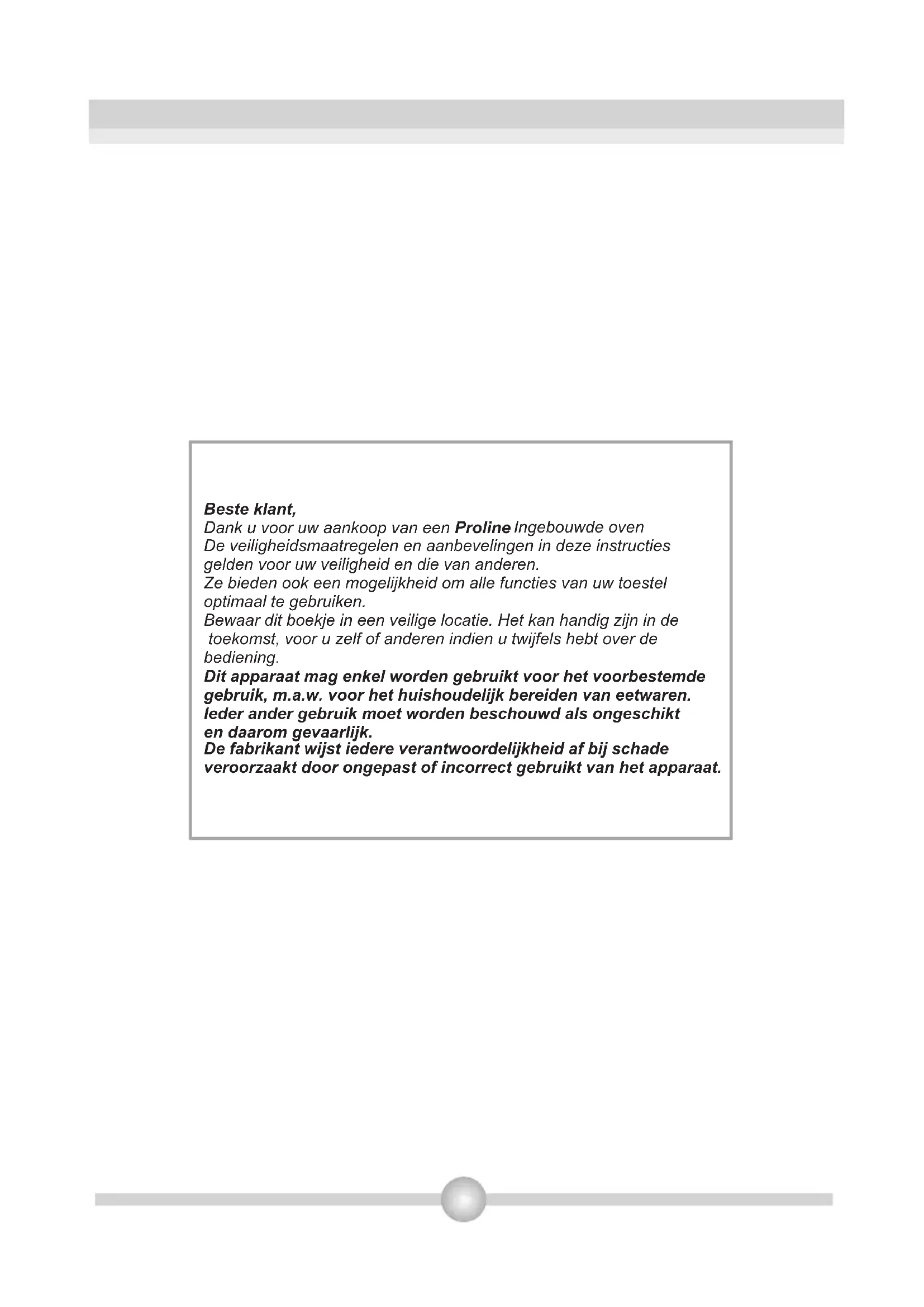 de ce produit, contactez les autorités locales, le centre de collecte des ordures ménagères ou le magasin où vous avez acheté le produit. l'élimination correcte de ce produit, vous évitez des effets négatifs su l'environnement et la santé humaine qui peuvent être causés par un élimination incorrecte de ce produit. Pour plus d'informations sur le recyclagINGEBOUWDE OVEN GEBRUIKSHANDLEIDING EN INSTALLATIE INSTRUCTIES EBA Multi 5X ST / BAIX NLBeste klant, Dank u voor uw aankoop van een Proline De veiligheidsmaatregelen en aanbevelingen in deze instructies gelden voor uw veiligheid en die van anderen. Ze bieden ook een mogelijkheid om alle functies van uw toestel optimaal te gebruiken. Bewaar dit boekje in een veilige locatie. Het kan handig zijn in de toekomst, voor u zelf of anderen indien u twijfels hebt over de bediening. Dit apparaat mag enkel worden gebruikt voor het voorbestemde gebruik, m.a.w. voor het huishoudelijk bereiden van eetwaren. Ieder ander gebruik moet worden beschouwd als ongeschikt en daarom gevaarlijk. De fabrikant wijst iedere verantwoordelijkheid af bij schade veroorzaakt door ongepast of incorrect gebruikt van het apparaat. Ingebouwde ovenInhoudsopgave