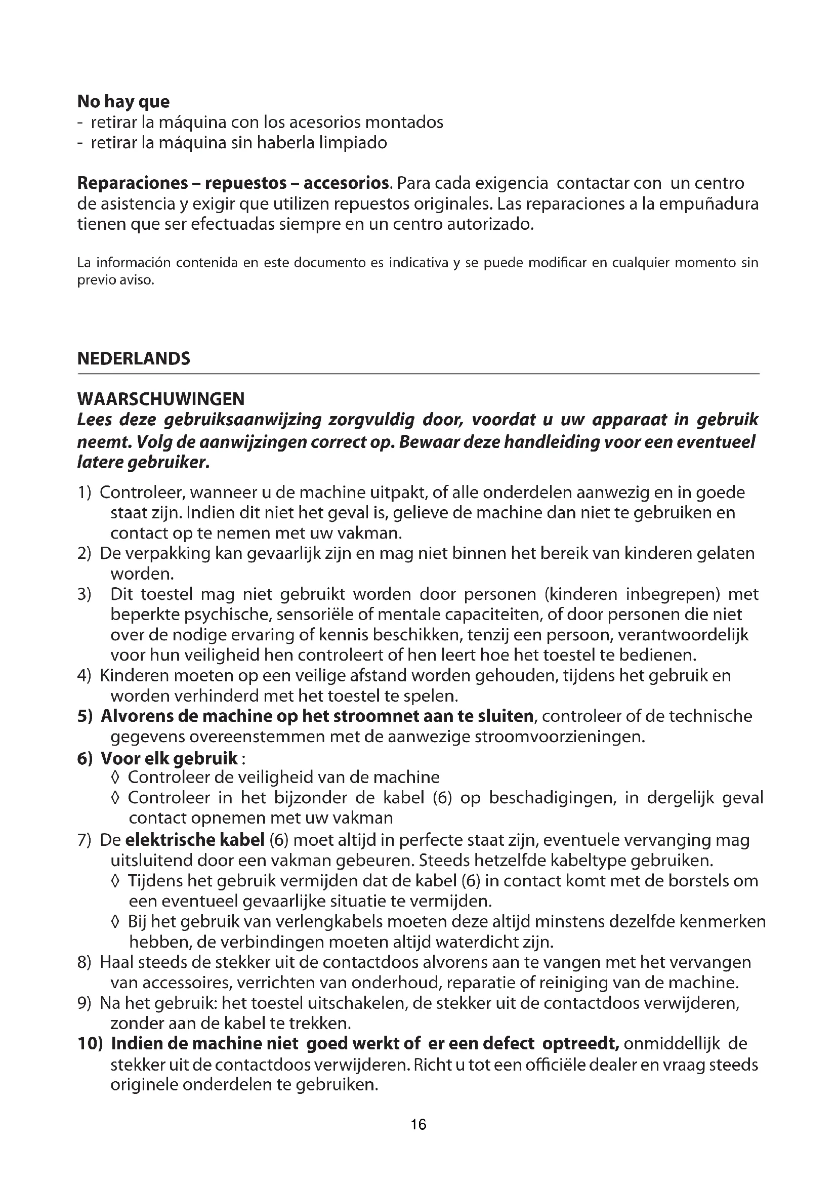 17) Dit model is ontwikkeld voor het gebruik van door de fabrikant aangeraden accessoires (padhouser, borstels, pads, enz.). Het gebruik van andere accessoires kan de correcte werkinq in het gedrang brengen en eventueel schade berokkenen aan de machine. De fabrikant is Niet verantwoordelijk voor dergelijk schade.