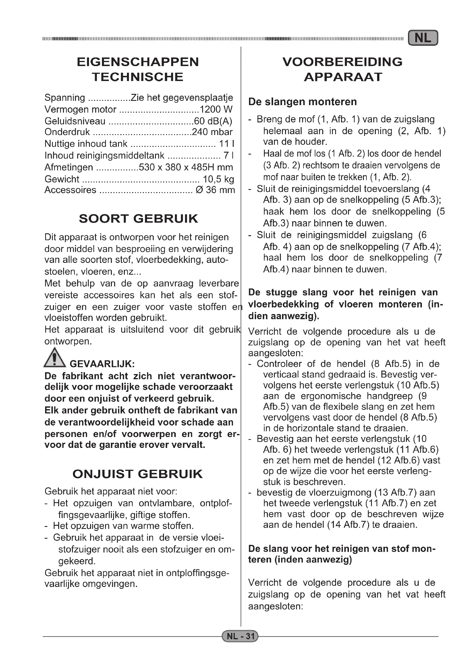 O aspirador não funciona. Interruptor não pressionado. Ficha não inserida na tomada. Falta de corrente de alimentação. Pressionar o interruptor. Inserir a cha na tomada de corrente. Verificar a linha de alimentação. A sucção não é satisfatória. Acessórios e/ou tubos obturados. Raspador de borracha para sucção danificado ou desgastado. Controlar e limpar o tubo fle- xível e o acessório terminal de sucção. Controlar e substituir o raspador. Distribuição de detergente não uniforme. Bico aspersor obturado. Filtro obturado. Limpar o bico aspersor. Limpar o filtro de sucção. A distribuição de detergente não inicia. Interruptor não pressionado. Pressionar o interruptor.NL NL - 31 EIGENSCHAPPEN TECHNISCHE Spanning ................Zie het gegevensplaatje Vermogen motor ..............................1200 W Geluidsniveau ................................60 dB(A) Onderdruk .....................................240 mbar Nuttige inhoud tank ................................ 11 l Inhoud reinigingsmiddeltank .................... 7 l Afmetingen ................530 x 380 x 485H mm Gewicht ............................................ 10,5 kg Accessoires ................................... Ø 36 mm SOORT GEBRUIK Dit apparaat is ontworpen voor het reinigen door middel van besproeiing en verwijdering van alle soorten stof, vloerbedekking, auto- stoelen, vloeren, enz... Met behulp van de op aanvraag leverbare vereiste accessoires kan het als een stof- zuiger en een zuiger voor vaste stoffen en vloeistoffen worden gebruikt. Het apparaat is uitsluitend voor dit gebruik ontworpen. GEVAARLIJK: De fabrikant acht zich niet verantwoor- delijk voor mogelijke schade veroorzaakt door een onjuist of verkeerd gebruik. Elk ander gebruik ontheft de fabrikant van de verantwoordelijkheid voor schade aan personen en/of voorwerpen en zorgt er- voor dat de garantie erover vervalt. ONJUIST GEBRUIK Gebruik het apparaat niet voor: - Het opzuigen van ontvlambare, ontplof- fingsgevaarlijke, giftige stoffen. - Het opzuigen van warme stoffen. - Gebruik het apparaat in de versie vloei- stofzuiger nooit als een stofzuiger en om- gekeerd. Gebruik het apparaat niet in ontploffingsge- vaarlijke omgevingen. VOORBEREIDING APPARAAT De slangen monteren - Breng de mof (1, Afb. 1) van de zuigslang helemaal aan in de opening (2, Afb. 1) van de houder.