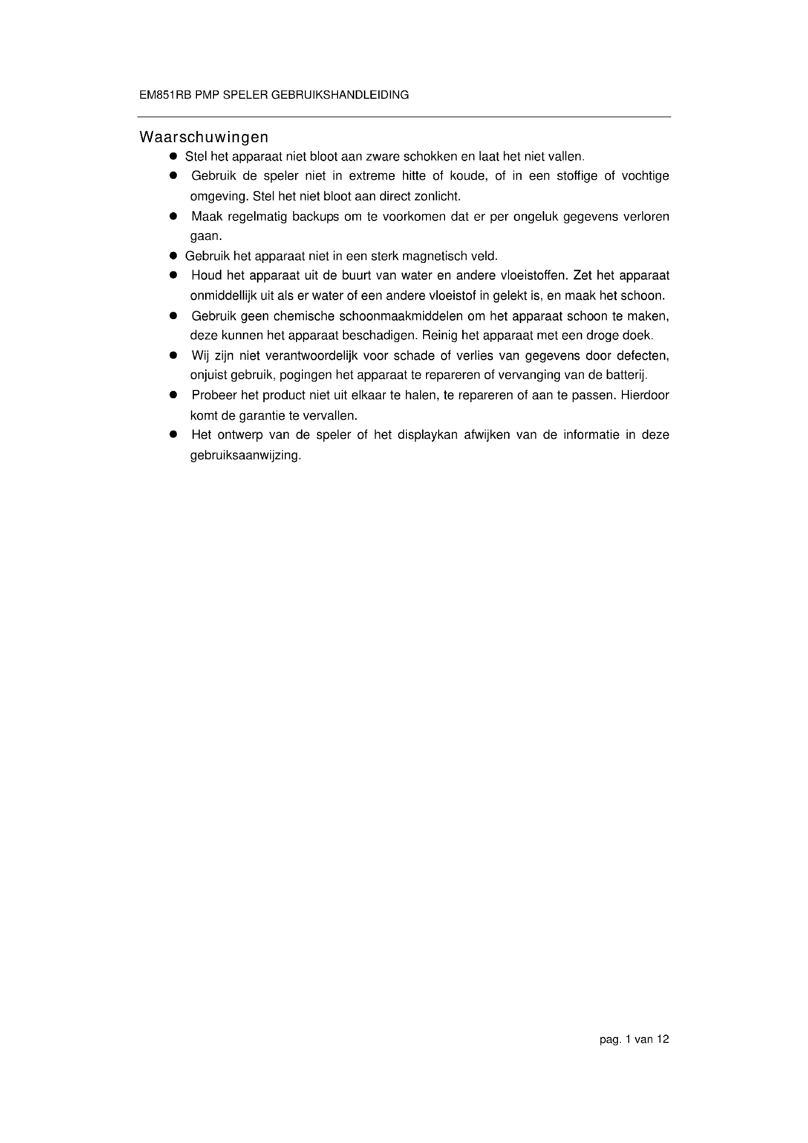 pag. 1 van 12 Waarschuwingen z Stel het apparaat niet bloot aan zware schokken en laat het niet vallen. z Gebruik de speler niet in extreme hitte of koude, of in een stoffige of vochtige omgeving. Stel het niet bloot aan direct zonlicht. z Maak regelmatig backups om te voorkomen dat er per ongeluk gegevens verloren gaan. z Gebruik het apparaat niet in een sterk magnetisch veld. z Houd het apparaat uit de buurt van water en andere vloeistoffen. Zet het apparaat onmiddellijk uit als er water of een andere vloeistof in gelekt is, en maak het schoon. z Gebruik geen chemische schoonmaakmiddelen om het apparaat schoon te maken, deze kunnen het apparaat beschadigen. Reinig het apparaat met een droge doek. z Wij zijn niet verantwoordelijk voor schade of verlies van gegevens door defecten, onjuist gebruik, pogingen het apparaat te repareren of vervanging van de batterij. z Probeer het product niet uit elkaar te halen, te repareren of aan te passen. Hierdoor komt de garantie te vervallen. z Het ontwerp van de speler of het displaykan afwijken van de informatie in deze gebruiksaanwijzing.EM851RB PMP SPELER GEBRUIKSHANDLEIDING pag. 2 van 12 1 Eigenschappen z MP3&WMA-speler z AVI-Video-speler z JPEG Image viewer z Map-navigatie z Dictafoon z FM-radio z FM-codering z Verwijderbaar opslagapparaat z Leuke spelletjes z Ingebouwde oplaadbare lithium-ion batterij. z Persoonlijke voorkeursinstellingen 2 Systeemvereisten z Hardware: IBM PC & Compatible PC, Notebook met USB interface z Besturingssysteem: Windows98/SE, Windows Me, Windows2000/XP 3 Inhoud verpakking Kijkt u alstublieft na of de volgende onderdelen in de verpakking bijgevoegd zijn. Neem contact op met de verkoper als één van de onderdelen ontbreekt. z Speler z Stereo oortelefoons z USB-kabel z Gebruiksaanwijzing z Installatie-CD 4 Voor gebruik