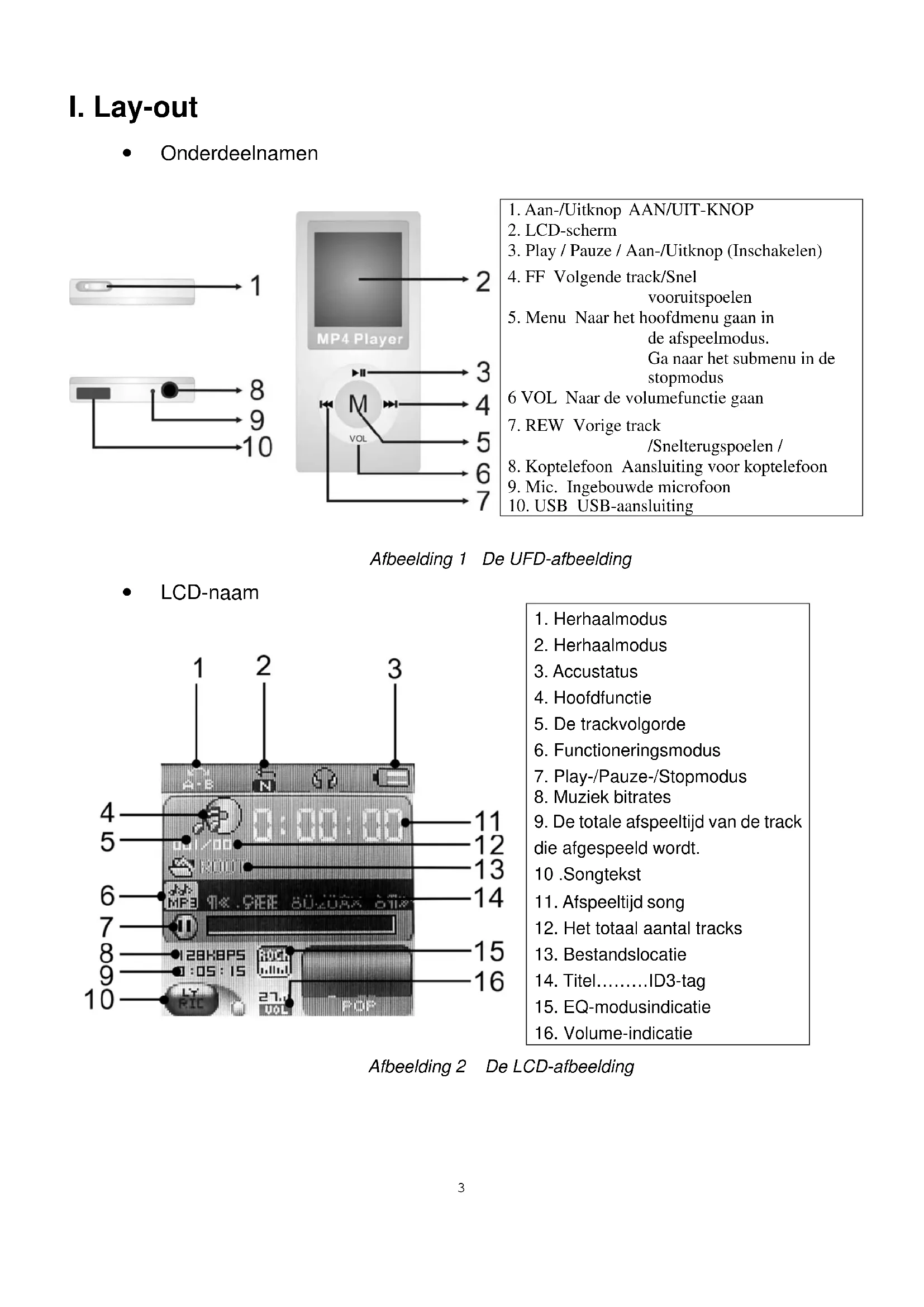 Kort Verlaag het volume. Verlaag het volume. X X Opmerking: Kort: druk de toets in voor 1 seconde Lang: druk de toets in voor 3 seconden B. Instructie (a) Eenvoudige bediening y Sluit de koptelefoon goed aan op de koptelefoonaansluiting. y Controleer of het apparaat ingeschakeld is. y Druk lang op f en de speler gaat naar de laatste modus. y Druk op of om de Muziekmodus te selecteren en druk op de MENU-knop om naar de Muziekmodus te gaan. y Muziekselectie: Druk op of om tracks te selecteren.Volume-aanpassing: Druk op de VOL-knop om naar de volumemodus te gaan en druk daarna op / om het volume aan te passen. y Opgelet: De speler gaat automatisch uit wanneer het niet in de afspeelmodus is. (b) Equalizer y Druk tijdens het afspelen van muziek op: y MENU om naar het submenu van de afspeelmodus te gaan y / om de equalizer te selecteren. y Druk kort op MENU om het te bevestigen. y Druk daarna op / om de EQ te selecteren: Natural, Rock, Pop, Classic, Soft, Jazz en DBB (c) Songteksten activeren Deze speler ondersteunt *.LRC-bestanden. Als er songteksten in de zelfde map van de MP3 staan met dezelfde naam, dan zal de speler de MP3 en songteksten synchroniseren. Als er een songtekst is voor de track dan “LYRIC” op het LCD-display7 groen oplichten. y Als er een songtekst is dan zal het songtekstenlampje groen gaan oplichten. y Druk lang op de MENU-knop om er naar de songteksteninterface te gaan y De songteksten interface zal op het scherm verschijnen. y Druk op MENU om terug te gaan naar de titelinterface: