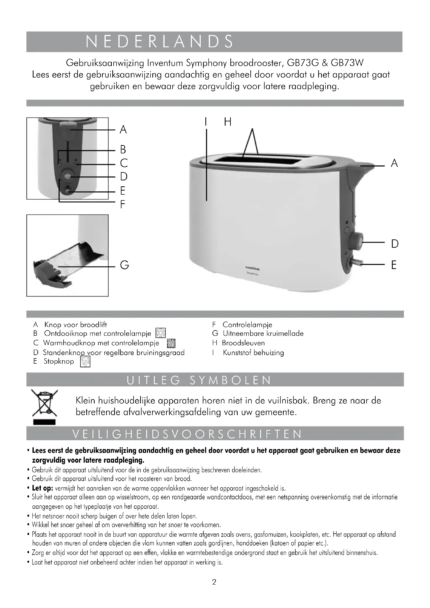 Gebruiksaanwijzing Inventum Symphony broodrooster, GB73G & GB73W Lees eerst de gebruiksaanwijzing aandachtig en geheel door voordat u het apparaat.gaat gebruiken en bewaar deze zorgvuldig voor latere raadpleging.