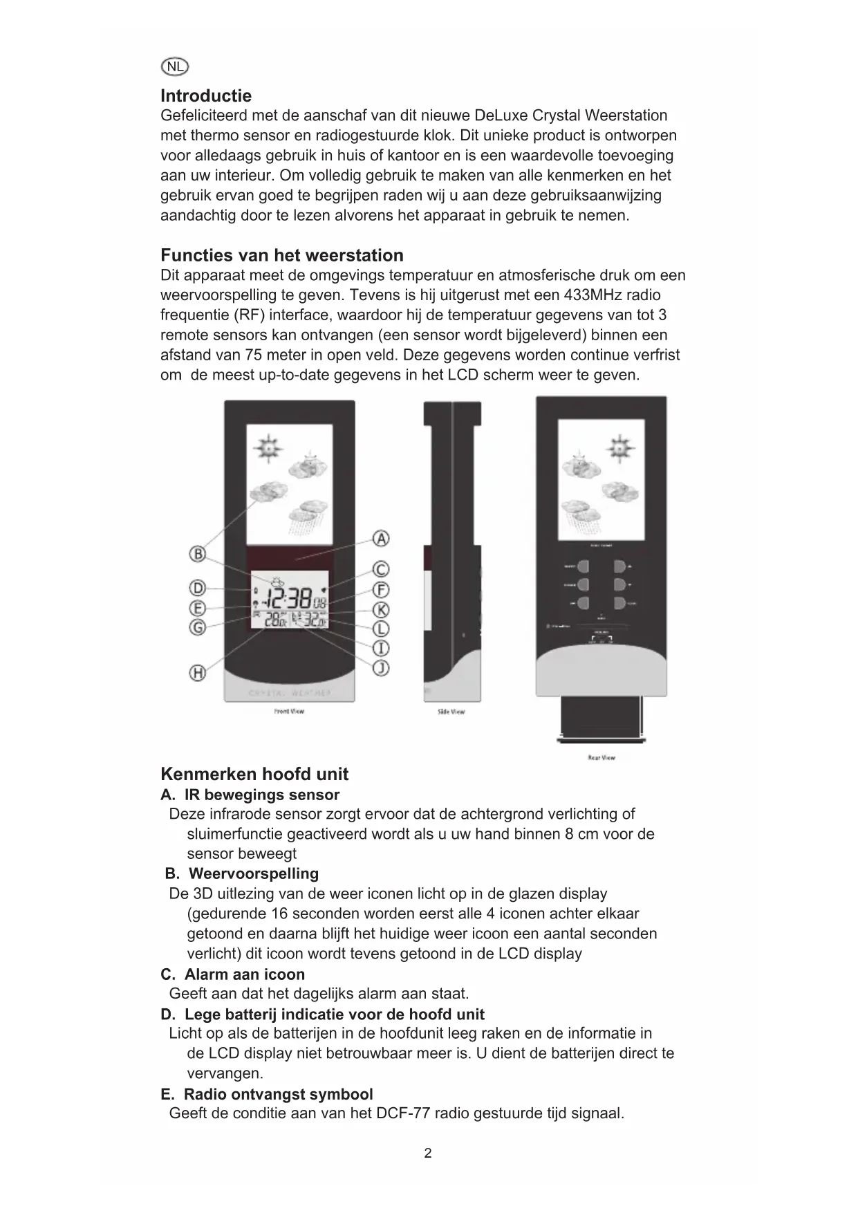 Gefeliciteerd met de aanschaf van dit neue DeLuxe Crystal Weerstation met thermo sensor en radiogestuurde klok. Dit uneke product is ontworpen voor alledaags gebruik in huis of kantoor en is een waardevolle toevoeging aan uw interieur. Om volledig gebruik te makes van alle kenmerken en het gebruik ervan goed te begrijpen raden wij u aan deze gebruiksaanwijzing aandachtig door te lezen Alvorens het apparaat in gebruik te nemen.