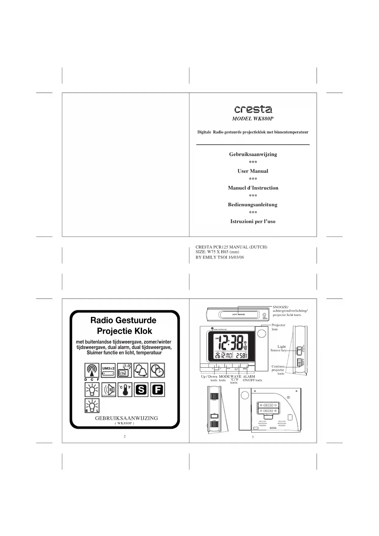 Download de handleiding voor uw Klok in PDF-formaat gratis! Vind uw handleiding WK310T - Cresta en neem uw elektronisch apparaat weer in handen. Op deze pagina staan alle documenten die nodig zijn voor het gebruik van uw apparaat. WK310T van het merk Cresta.