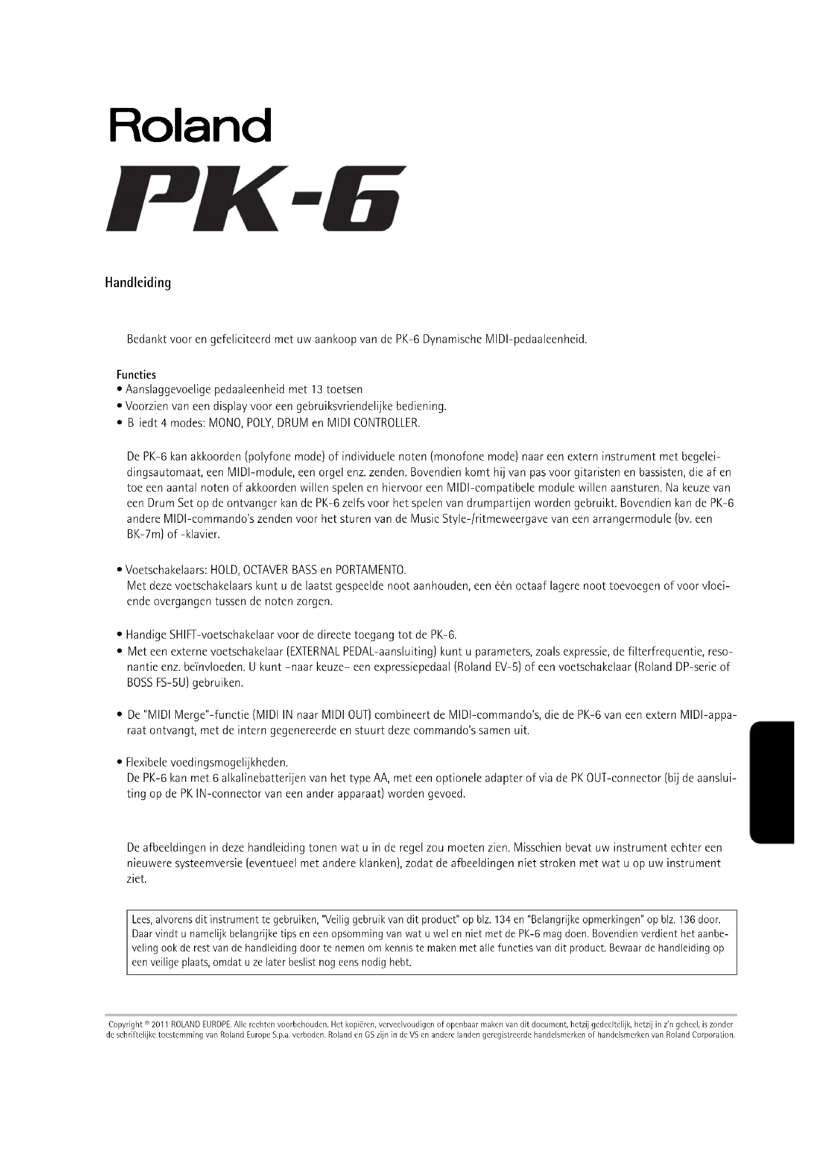 - Flexibele voedingsmogelijkheden. De PK-6 kan met 6 alkalinebatterijen van het type AA, met een optionele adapter of via de PK OUT-connector (bij de aanslui- ting op de PK IN-connector van een ander apparaat) worden gevoed. De afbeeldingen in deze handleiding tonen wat u in de regel zou moeten zien. Misschien bevat uw instrument echter een nieuwere systeemversie (eventueel met andere klanken), zodat de afbeeldingen niet stroken met wat u op uw instrument ziet. Lees, alvorens dit instrument te gebruiken, “Veilig gebruik van dit product” op blz. 134 en “Belangrijke opmerkingen” op blz. 136 door. Daar vindt u namelijk belangrijke tips en een opsomming van wat u wel en niet met de PK-6 mag doen. Bovendien verdient het aanbe- veling ook de rest van de handleiding door te nemen om kennis te maken met alle functies van dit product. Bewaar de handleiding op een veilige plaats, omdat u ze later beslist nog eens nodig hebt. Copyright © 2011 ROLAND EUROPE. Alle rechten voorbehouden. Het kopiëren, verveelvoudigen of openbaar maken van dit document, hetzij gedeeltelijk, hetzij in z’n geheel, is zonder de schriftelijke toestemming van Roland Europe S.p.a. verboden. Roland en GS zijn in de VS en andere landen geregistreerde handelsmerken of handelsmerken van Roland Corporation. Handleiding PK-6_multi.book Page 133 Friday, January 13, 2012 1:58 PM134