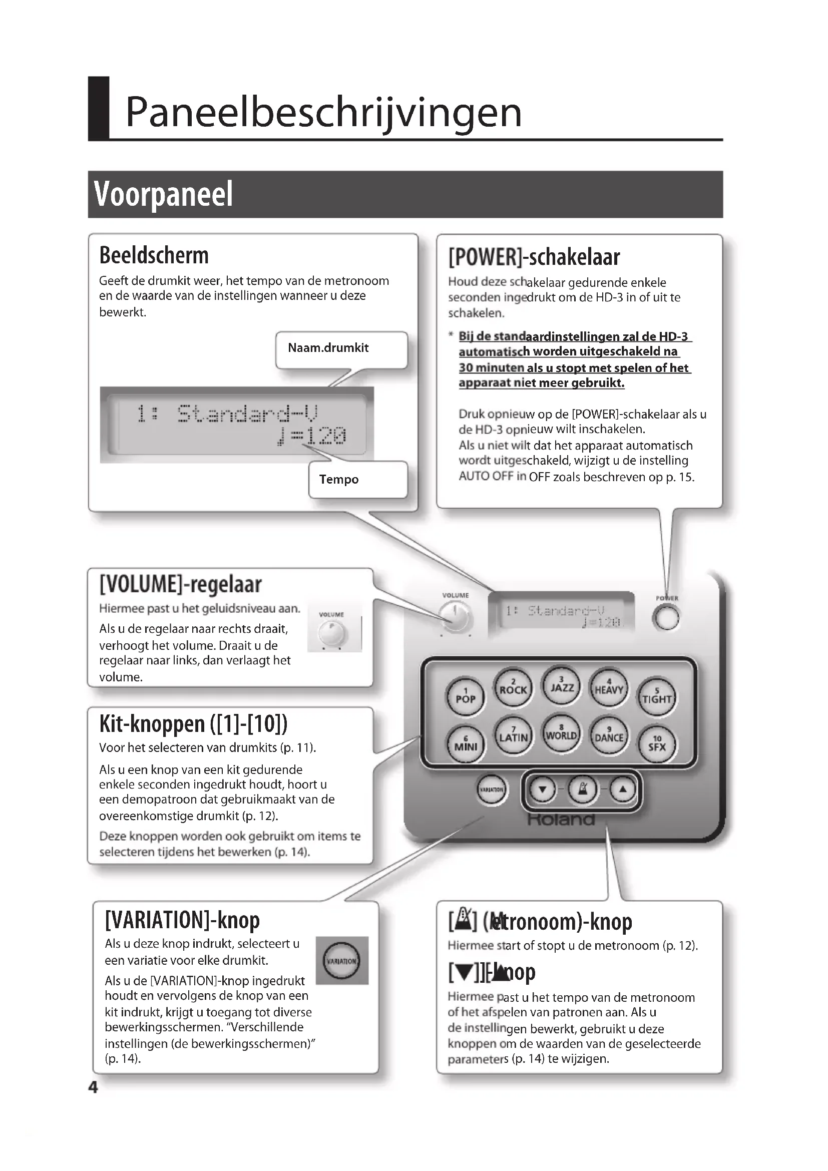- 5 1 0 0 0 2 3 4 9 2 - 0 2 *Deutsch Français Italiano Español Português NederlandsEnglishBelangrijkste functies Een grote verscheidenheid aan geluiden De HD-3 bevat 20 verschillende drumkits die zijn ontworpen om te worden gebruikt voor alle muziekstijlen. Referentie “Lijst met drumkitklanken” (p. 17) Beleef plezier, ook als u alleen speelt Als u een hoofdtelefoon gebruikt, hoort alleen u wat u speelt. In tegenstelling tot akoestische drums worden geen luide geluiden geproduceerd, zodat u kunt spelen zonder dat u zich zorgen hoeft te maken dat u anderen lastig valt. Op de MIX IN-aansluiting kunt u externe audiobronnen aansluiten, zodat u kunt samenspelen met audiospelers enz. Een compact drumstel De HD-3 is compact en eenvoudig te gebruiken en op te stellen waar u maar wilt. Speel wanneer u wilt Schakel de HD-3 in, selecteer een drumkit en begin te spelen. Lees zorgvuldig onderstaande hoofdstukken voordat u dit apparaat gebruikt: 'HET APPARAAT VEILIG GEBRUIKEN' en 'BELANGRIJKE OPMERKINGEN' (de achterzijde van de Installatiehandleiding). Deze hoofdstuk- ken bevatten belangrijke informatie over de juiste bediening van het apparaat. Om er bovendien zeker van te zijn dat u elke functie van uw nieuwe apparaat goed begrijpt, leest u best de Gebruikershandleiding en de Installatiehandleiding. De handleiding moet als handige referentie worden bewaard en voorhanden zijn. Copyright © 2011 ROLAND CORPORATION Alle rechten voorbehouden. Niets uit deze uitgave mag op enige manier worden gereproduceerd zonder schriftelijke toestemming van ROLAND CORPORATION. Roland, V-Drums en V-Drums Lite zijn gedeponeerde handelsmerken of handelsmerken van Roland Corporation in de Verenigde Staten en/of andere landen.3 Deutsch Français Italiano Español Português NederlandsEnglish Inhoudsopgave Belangrijkste functies. . . . . . . . . . . . . . . . . . . . . . . . . . . . . . . . . . . . . . . . . . . . . . . . . . . . . . 2 Paneelbeschrijvingen . . . . . . . . . . . . . . . . . . . . . . . . . . . . . . . . . . . . . . . . . . . . . . . . . . . . . .4 Voorpaneel . . . . . . . . . . . . . . . . . . . . . . . . . . . . . . . . . . . . . . . . . . . . . . . . . . . . . . . . . . . . . . . 4 Zijpaneel. . . . . . . . . . . . . . . . . . . . . . . . . . . . . . . . . . . . . . . . . . . . . . . . . . . . . . . . . . . . . . . . . . 5 Het drumstel . . . . . . . . . . . . . . . . . . . . . . . . . . . . . . . . . . . . . . . . . . . . . . . . . . . . . . . . . . . . . .6 Drumstelelementen . . . . . . . . . . . . . . . . . . . . . . . . . . . . . . . . . . . . . . . . . . . . . . . . . . . . . . . 6 Als u begint te spelen . . . . . . . . . . . . . . . . . . . . . . . . . . . . . . . . . . . . . . . . . . . . . . . . . . . . . 8 Drumnotaties lezen . . . . . . . . . . . . . . . . . . . . . . . . . . . . . . . . . . . . . . . . . . . . . . . . . . . . . . 10 Het spelen van een kit . . . . . . . . . . . . . . . . . . . . . . . . . . . . . . . . . . . . . . . . . . . . . . . . . . . . .11 Het apparaat in- en uitschakelen . . . . . . . . . . . . . . . . . . . . . . . . . . . . . . . . . . . . . . . . . . 11 Een kit selecteren . . . . . . . . . . . . . . . . . . . . . . . . . . . . . . . . . . . . . . . . . . . . . . . . . . . . . . . . 11 Luisteren naar patronen . . . . . . . . . . . . . . . . . . . . . . . . . . . . . . . . . . . . . . . . . . . . . . . . . . 12 Spelen met de metronoom . . . . . . . . . . . . . . . . . . . . . . . . . . . . . . . . . . . . . . . . . . . . . . . 12 Verschillende instellingen (de bewerkingsschermen) . . . . . . . . . . . . . . . . . . . . . . .14 Basisfuncties in de bewerkingsschermen . . . . . . . . . . . . . . . . . . . . . . . . . . . . . . . . . . 14 Lijst met parameters . . . . . . . . . . . . . . . . . . . . . . . . . . . . . . . . . . . . . . . . . . . . . . . . . . . . . 15 Het geluid van de metronoom wijzigen . . . . . . . . . . . . . . . . . . . . . . . . . . . . . 15 Het metronoomvolume aanpassen . . . . . . . . . . . . . . . . . . . . . . . . . . . . . . . . . 15 Het beeldschermcontrast aanpassen . . . . . . . . . . . . . . . . . . . . . . . . . . . . . . . . 15 De HD-3 automatisch uitschakelen (Auto O) . . . . . . . . . . . . . . . . . . . . . . . 15 De padinstellingen omwisselen voor linkshandige spelers . . . . . . . . . . . 15 De padgevoeligheid aanpassen . . . . . . . . . . . . . . . . . . . . . . . . . . . . . . . . . . . . . 16 Het nootnummer van de pad wijzigen . . . . . . . . . . . . . . . . . . . . . . . . . . . . . . 16 Het nootnummer voor cross-sticking instellen . . . . . . . . . . . . . . . . . . . . . . 16 De standaardinstellingen opnieuw instellen . . . . . . . . . . . . . . . . . . . . . . . . . 16 Appendix . . . . . . . . . . . . . . . . . . . . . . . . . . . . . . . . . . . . . . . . . . . . . . . . . . . . . . . . . . . . . . . . .17 Lijst met drumkitklanken . . . . . . . . . . . . . . . . . . . . . . . . . . . . . . . . . . . . . . . . . . . . . . . . . 17 Informatie over MIDI . . . . . . . . . . . . . . . . . . . . . . . . . . . . . . . . . . . . . . . . . . . . . . . . . . . . . 18 Problemen oplossen . . . . . . . . . . . . . . . . . . . . . . . . . . . . . . . . . . . . . . . . . . . . . . . . . . . . . 20 De instellingen van de HD-3 instellen voor linkshandigen . . . . . . . . . . . . . . . . . 21 Belangrijkste specicaties . . . . . . . . . . . . . . . . . . . . . . . . . . . . . . . . . . . . . . . . . . . . . . . . .224 Voorpaneel Paneelbeschrijvingen [ ] (Metronoom)-knop Hiermee start of stopt u de metronoom (p. 12). [ ] [ ]-knop Hiermee past u het tempo van de metronoom of het afspelen van patronen aan. Als u de instellingen bewerkt, gebruikt u deze knoppen om de waarden van de geselecteerde parameters (p. 14) te wijzigen. Kit-knoppen ([1]-[10]) Voor het selecteren van drumkits (p. 11). Als u een knop van een kit gedurende enkele seconden ingedrukt houdt, hoort u een demopatroon dat gebruikmaakt van de overeenkomstige drumkit (p. 12). Deze knoppen 