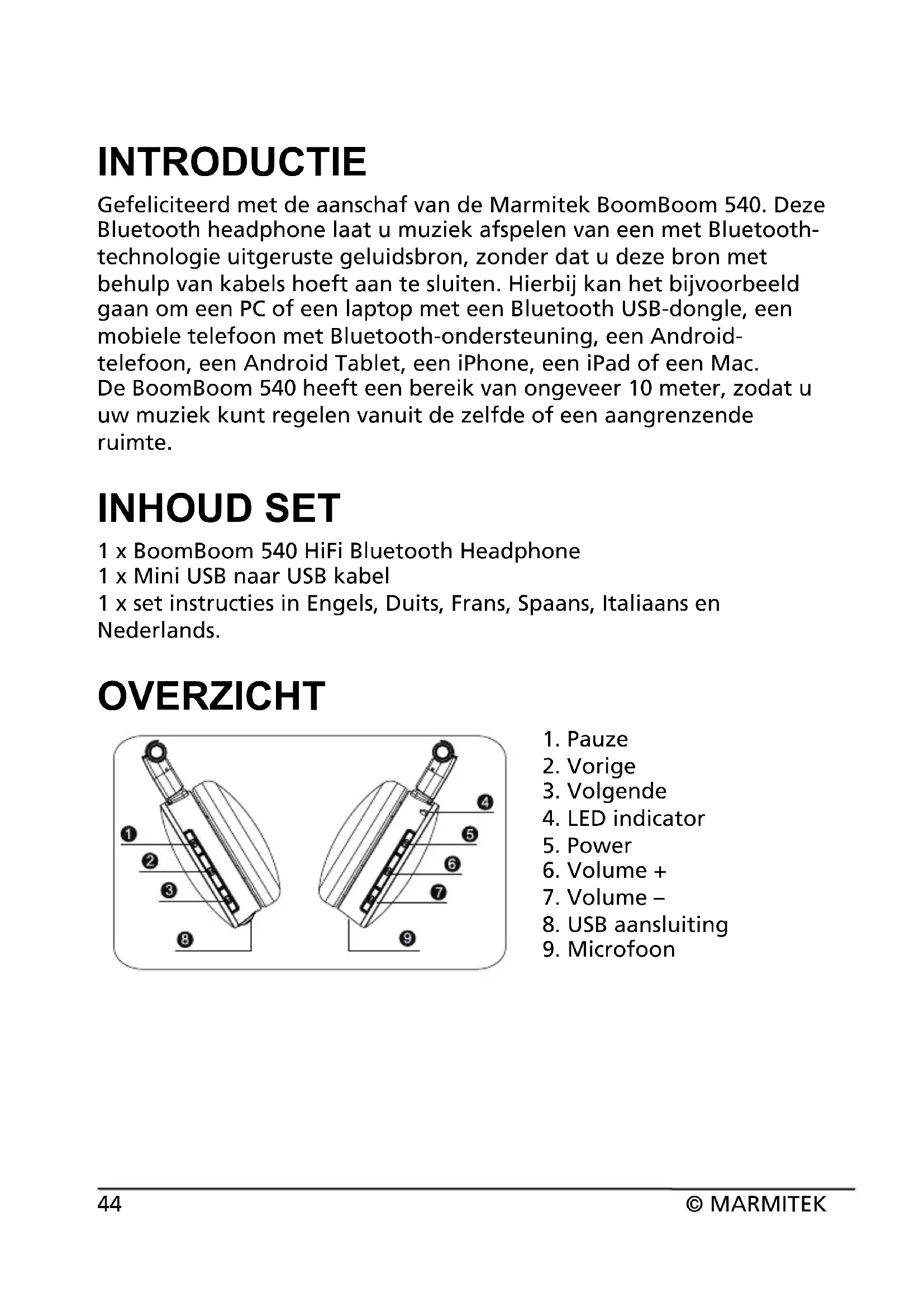 Gefeliciteerd met de aanschaf van de Marmitek BoomBoom 540. Deze Bluetooth headphone laat u muziek afspelen van een met Bluetooth- technologie uitgeruste geluidsbron, zonder dat u deze bron met behulp van kabels hoeft aan te sluiten. Hierbij kan het bijvoorbeeld gaan om een PC of een laptop met een Bluetooth USB-dongle, een mobiele telefoon met Bluetooth-ondersteuning, een Android- telefoon, een Android Tablet, een iPhone, een iPad of een Mac. De BoomBoom 540 heeft een bereik van ongeveer 10 meter, zodat u uw muziek kunt regelen vanuit de zelfde of een aangrenzende ruimte. INHOUD SET 1 x BoomBoom 540 HiFi Bluetooth Headphone 1 x Mini USB naar USB kabel 1 x set instructies in Engels, Duits, Frans, Spaans, Italiaans en Nederlands. OVERZICHT