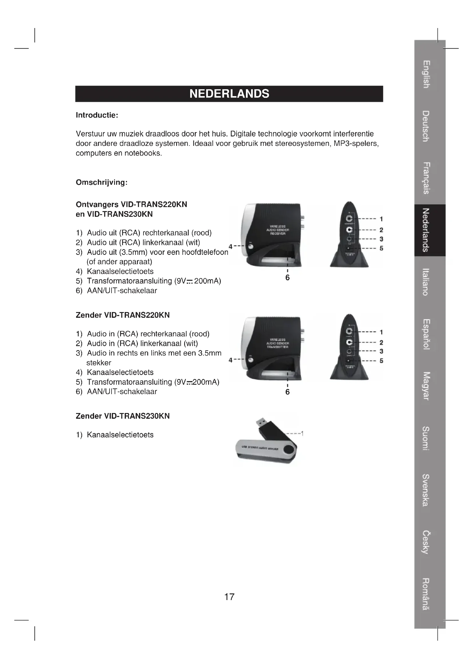 de kanaalselectietoets op de ontvanger. Die zal dan automatisch afstemmen op het gebruikte kanaal. Specificaties: Zender VID-TRANS220KN Frequentiebereik: 2.400~2.483Ghz Kanalen: 8 Modulatie: FSK (Frequency Shift Keying) Audio-ingangen: 2x RCA (R/L), 3.5mm Voedingsspanning: 9V/200mA Zender VID-TRANS230KN Frequentiebereik: 2.400~2.483 Ghz Kanalen: 8 Modulatie: FSK (Frequency Shift Keying) Audio-ingangen: via USB Voedingsspanning: via USB Ontvangers VID-TRANS220KN en VID-TRANS230KN Frequentiebereik: 2.400~2.483 Ghz Kanalen: 8 Modulatie: FSK (Frequency Shift Keying) Audio-uitgang 2x RCA, 3.5mm Signaal/ruis verhouding: 87dB Voedingsspanning: 9V/200mA20 CONFORMITEITVERKLARING Wij, Nedis BV De Tweeling 28 5215 MC ’s-Hertogenbosch Nederland Tel.: 0031 73 599 1055 E-mail: info@nedis.com Verklaren dat de producten: Merknaam: König Electronic Model: VID-TRANS220KN, VID-TRANS230KN Omschrijving: 2.4GHz draadloze audiozender voldoen aan de volgende standaarden: EN 300 440-1 V1.3.1 (2001-09), EN 300 440-2 V1.1.1 (2001-09), EN 50371:2002, EN 301 489-1 V1.4.1 (2002-08), EN 301 489-3 V1.4.1 (2002-08), EN 55022: 1998+A1:2000+A2:2003 KLASSE B, EN 61000-3-2:2000, EN 61000-3-3:1995+A1:2001, EN 61000-4-2:1995+A1:1998+A2:2001, EN 61000-4-3:2002+A1:2002, EN 61000-4-4:1995+A1:2001+A2:2001, EN 61000-4-5:1995+A1:2001, EN 61000-4-6:1996+A1:2001, EN 61000-4-11:1994+A1:2001 EN 60065:2002, EN 60950-1:2001+A11:2004 en voldoen aan de vereiste richtlijn 1999/5/EG van de Europese Unie. ‘s-Hertogenbosch, 22 oktober 2008 Mevr. J. Gilad Directeur inkoop21 Veiligheidsvoorzorgsmaatregelen: GEVAAR VOOR ELEKTRISCHE SCHOK NIET OPENEN LET OP: Wanneer service of reparatie noodzakelijk is, mag dit product UITSLUITEND door een geautoriseerde technicus geopend worden; dit om de kans op het krijgen van een elektrische schok te voorkomen. Als er een probleem optreedt, koppel het product dan los van het elektriciteitsnet en van andere apparatuur. Stel het product niet bloot aan water of vocht. Onderhoud: Uitsluitend reinigen met een droge doek. Gebruik geen reinigingsmiddelen of schuurmiddelen. Garantie: Voor wijzigingen en veranderingen aan het product of schade veroorzaakt door een verkeerd gebruik van dit product, kan geen aansprakelijkheid worden geaccepteerd. Tevens vervalt daardoor de garantie. Algemeen: Wijziging van ontwerp en specificaties zonder voorafgaande mededeling onder voorbehoud. Alle logo's, merken en productnamen zijn handelsmerken of geregistreerde handelsmerken van de respectievelijke eigenaren en worden hierbij als zodanig erkend. Let op: Dit product is voorzien van dit symbool. Dit symbool geeft aan dat afgedankte elektrische en elektronische producten niet met het gewone huisafval verwijderd mogen worden. Voor dit soort producten zijn er speciale inzamelingspunten. Copyright ©22 ITALIANO Introduzione: Per trasmettere la musica senza fili in tutta la casa. La tecnologia digitale elimina le interferenze di altri sistemi wireless. Perfetto da usare con impianti stereo, lettori MP3, computer e computer portatili. Descrizione: Ricevitore VID-TRANS220KN e VID-TRANS230KN