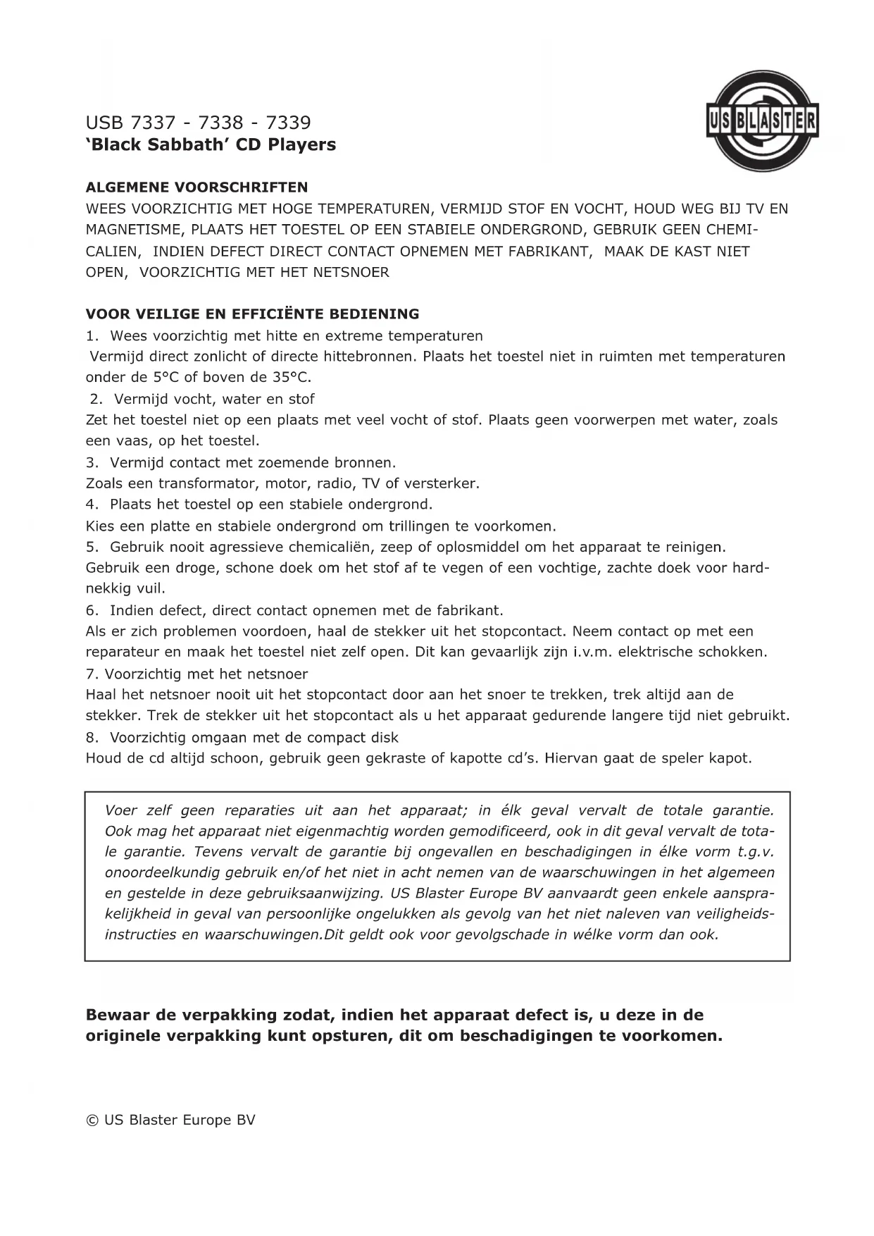 Voer zich geen reparaties uit aan het apparaat; in elk geval vervalt de totale garantie. Ook mag het apparaat Niet eigenmachtig worden gemodificeerd, ook in dit geval vervalt de totale garantie. Tevens vervalt de garantie bij ongevallen en beschadigingen inélke vom t.g.v. onoordeelkundig gebruik en/of het Niet in acht nemen van de waarschuwingen in het algemeen en gestelde in deze gebruiksaanwijzing. US Blaster Europe BV aanvaardt geen enkele aansprakelijkheid in geval van persoonlijke ongelukken als gevolg van het Niet naleven van veiligheids-instructies en waarschuwingen.Dit geldt ook voor gevolgschade in wélke vom dan ook.