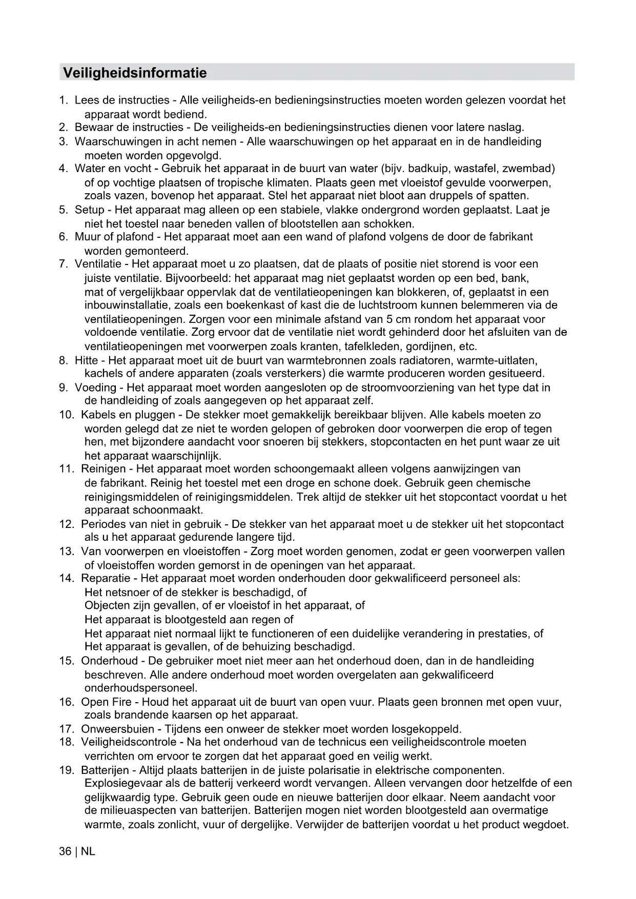 16. Open Fire - Houd het apparaat uit de buurt van open vuur. Plaats geen bronnen met open vuur,