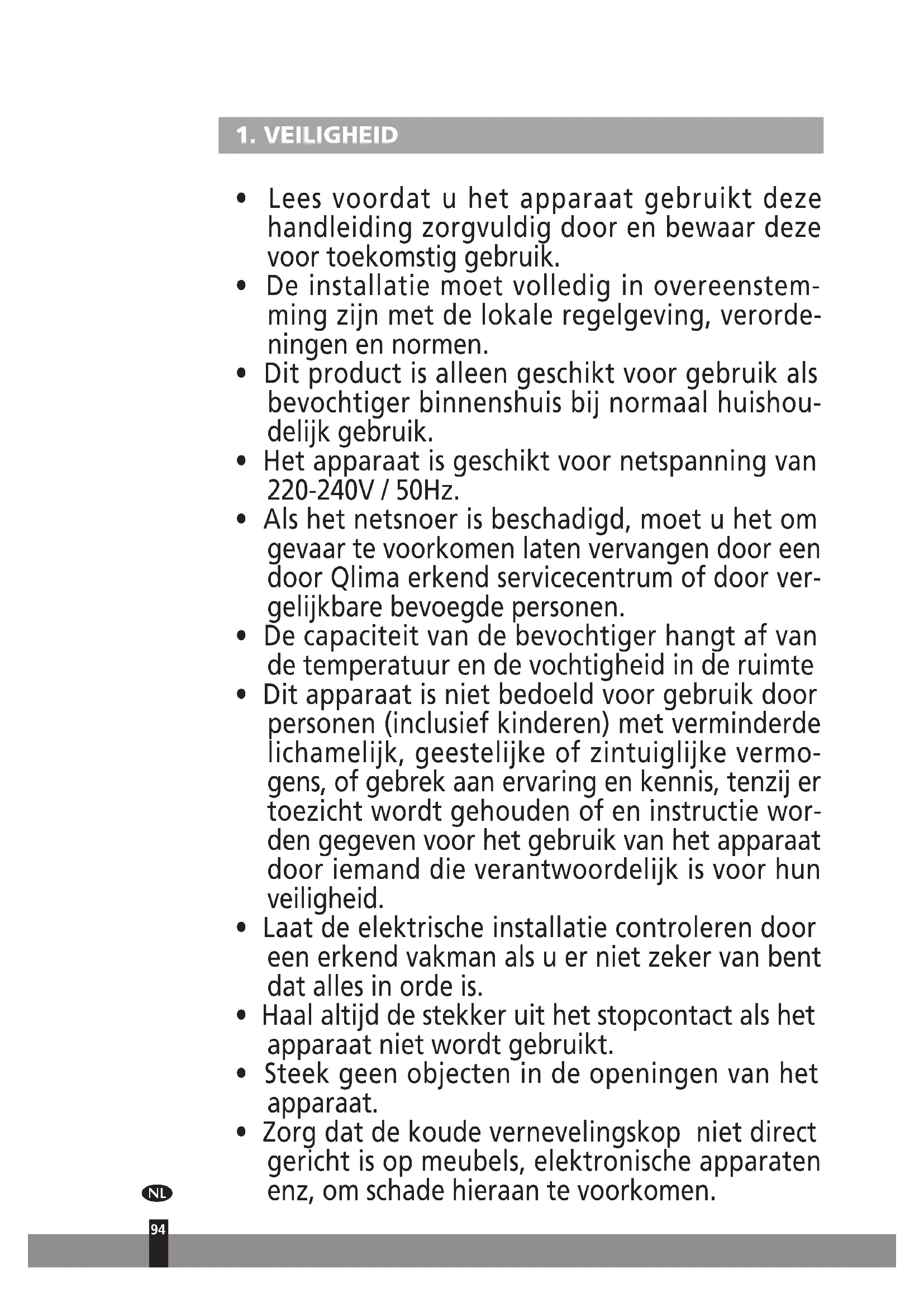 - De verzendkosten en het risico van het opsturen van de bevochtiger of onderdelen daarvan, komen altijd voor rekening van de koper. Om onnodige kosten te voorkomen. Raden wij u aan eerst altijd zorgvuldig de gebruiksaanwijzing te raadplegen. Wanneer deze geen uitkomst biedt. Breng de bevochtiger dan ter reparatie naar uw dealer. Werp elektrische apparatuur niet weg bij het huisvuil; lever het in op de daarvoor aangewezen plaats. Neem contact op met de plaatselijke autoriteiten voor informatie waar apparatuur kan worden ingeleverd. Wanneer elektrische apparaten worden weggegooid op de vuilstort of in de dump, kunnen gevaarlijke stoffen in het grondwater en in de voedselketen terecht komen met alle gevolgen voor de gezondheid. Bij de vervanging van oude apparaten door nieuwe is de leverancier wettelijk verplicht zonder kosten het oude apparaat voor vernietiging in te nemen. INTERNET Om u nog beter van dienst te zijn kunt u de meest recente versie van de gebruikers, installatie- en of service handleiding downloaden op www.qlima.com.
