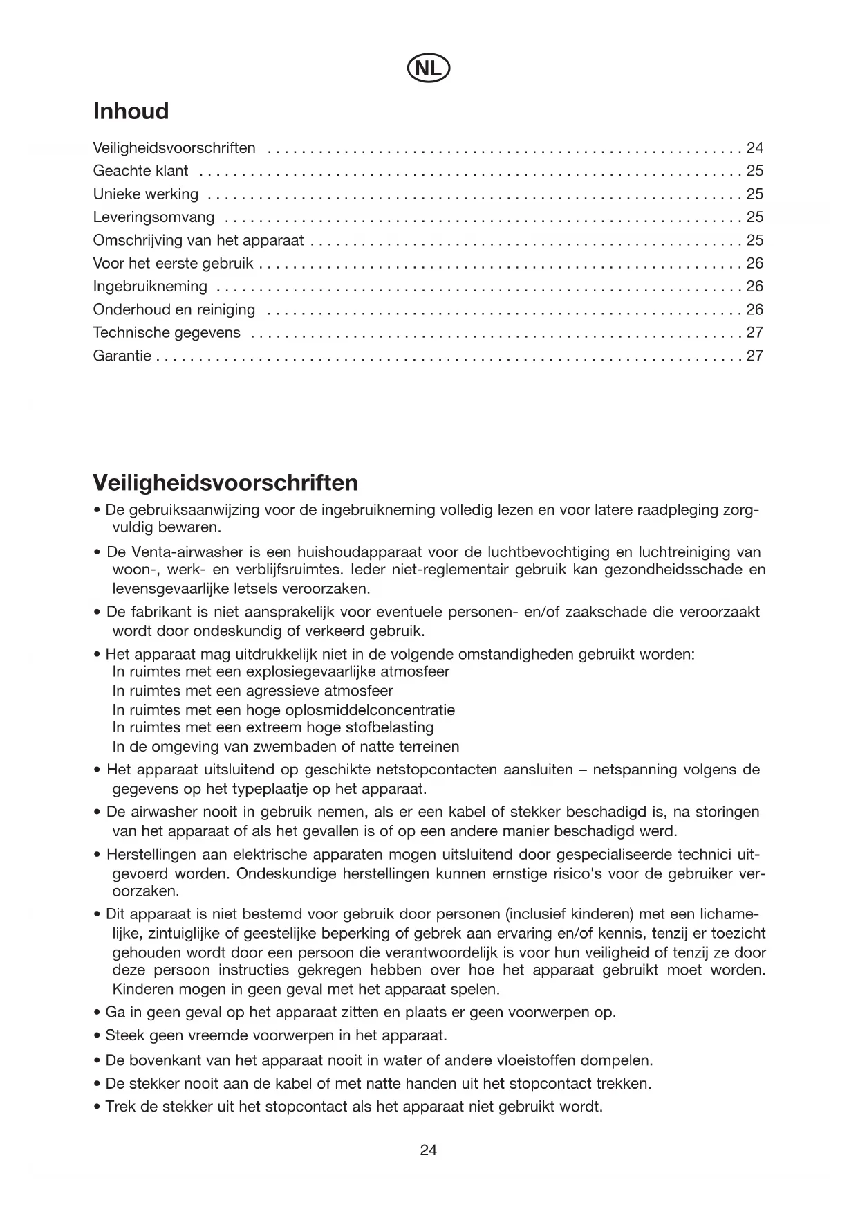 - De Venta-airwasher is een huishoudapparaat voor de luchtbevochtiging en luchtreiniging van woon-, werk- en verblijfsruimtes. Ieder niet-reglementair gebruik kan gezondheidsschade en levensgevaarlijke letsels veroorzaken.