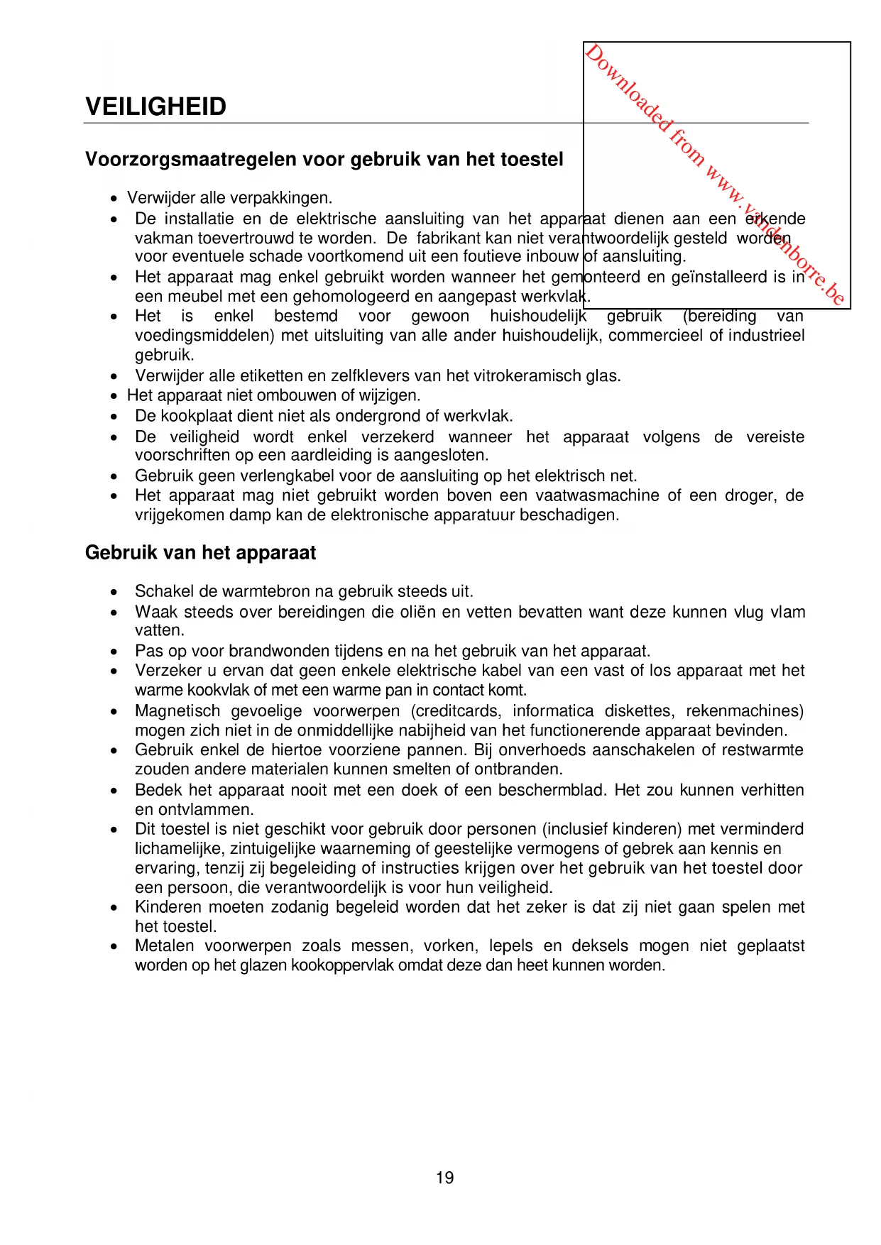 VEILIGHEID Voorzorgsmaatregelen voor gebruik van het toestel Verwijder alle verpakkingen. De installatie en de elektrische aansluiting van het apparaat dienen aan een erkende vakman toevertrouwd te worden. De fabrikant kan niet verantwoordelijk gesteld worden voor eventuele schade voortkomend uit een foutieve inbouw of aansluiting. Het apparaat mag enkel gebruikt worden wanneer het gemonteerd en geïnstalleerd is in een meubel met een gehomologeerd en aangepast werkvlak. Het is enkel bestemd voor gewoon huishoudelijk gebruik (bereiding van voedingsmiddelen) met uitsluiting van alle ander huishoudelijk, commercieel of industrieel gebruik. Verwijder alle etiketten en zelfklevers van het vitrokeramisch glas. Het apparaat niet ombouwen of wijzigen. De kookplaat dient niet als ondergrond of werkvlak. De veiligheid wordt enkel verzekerd wanneer het apparaat volgens de vereiste voorschriften op een aardleiding is aangesloten. Gebruik geen verlengkabel voor de aansluiting op het elektrisch net. Het apparaat mag niet gebruikt worden boven een vaatwasmachine of een droger, de vrijgekomen damp kan de elektronische apparatuur beschadigen. Gebruik van het apparaat Schakel de warmtebron na gebruik steeds uit. Waak steeds over bereidingen die oliën en vetten bevatten want deze kunnen vlug vlam vatten. Pas op voor brandwonden tijdens en na het gebruik van het apparaat. Verzeker u ervan dat geen enkele elektrische kabel van een vast of los apparaat met het warme kookvlak of met een warme pan in contact komt. Magnetisch gevoelige voorwerpen (creditcards, informatica diskettes, rekenmachines) mogen zich niet in de onmiddellijke nabijheid van het functionerende apparaat bevinden. Gebruik enkel de hiertoe voorziene pannen. Bij onverhoeds aanschakelen of restwarmte zouden andere materialen kunnen smelten of ontbranden. Bedek het apparaat nooit met een doek of een beschermblad. Het zou kunnen verhitten en ontvlammen. Dit toestel is niet geschikt voor gebruik door personen (inclusief kinderen) met verminderd lichamelijke, zintuigelijke waarneming of geestelijke vermogens of gebrek aan kennis en ervaring, tenzij zij begeleiding of instructies krijgen over het gebruik van het toestel door een persoon, die verantwoordelijk is voor hun veiligheid. Kinderen moeten zodanig begeleid worden dat het zeker is dat zij niet gaan spelen met het toestel. Metalen voorwerpen zoals messen, vorken, lepels en deksels mogen niet geplaatst worden op het glazen kookoppervlak omdat deze dan heet kunnen worden.Downloaded from www.vandenborre.be