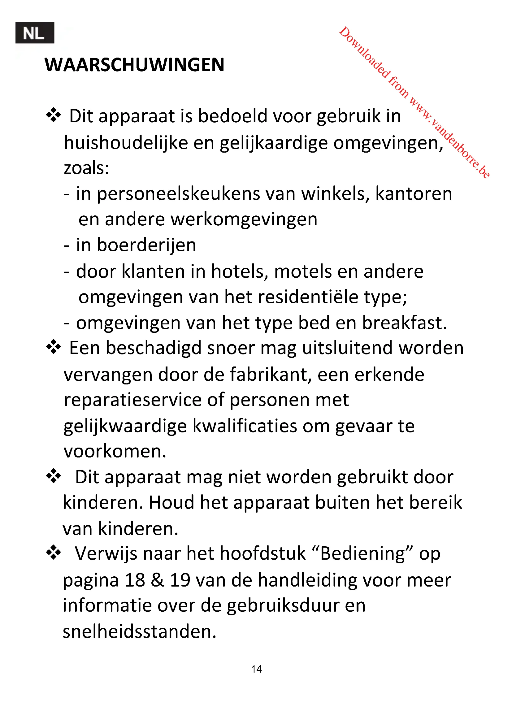 Downloaded from www.vandenborre.beWAARSCHUWINGEN Dit apparaat is bedoeld voor gebruik in huishoudelijke en gelijkaardige omgevingen, zoals: - in personeelskeukens van winkels, kantoren en andere werkomgevingen - in boerderijen - door klanten in hotels, motels en andere omgevingen van het residentiële type; - omgevingen van het type bed en breakfast. Een beschadigd snoer mag uitsluitend worden vervangen door de fabrikant, een erkende reparatieservice of personen met gelijkwaardige kwalificaties om gevaar te voorkomen. Dit apparaat mag niet worden gebruikt door kinderen. Houd het apparaat buiten het bereik van kinderen. Verwijs naar het hoofdstuk “Bediening” op pagina 18 & 19 van de handleiding voor meer informatie over de gebruiksduur en snelheidsstanden.