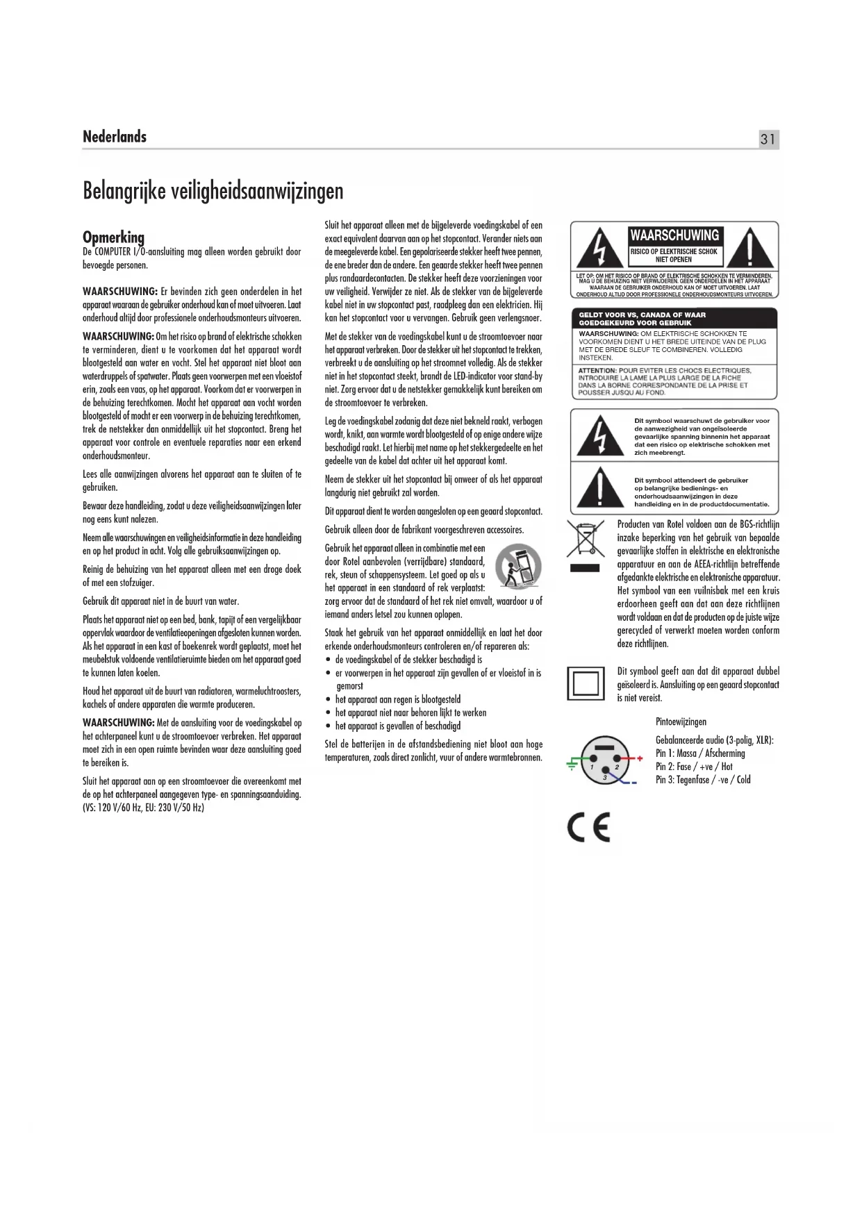 PC-USB Formato Notas Formato determinado por el software del Reproductor Multimedia (“Media Player”)/Servidor utilizado. Cualquier formato soportado por el software del PC: 44’1 kHz, 48 kHz, 88’2 kHz, 96 kHz, 176’4 kHz o 192 kHz. Cuantificación entre 16 y 24 bits. Coaxial/Óptica Formato Notas S/PDIF PCM Lineal (LPCM) 44’1 kHz, 48 kHz, 88’2 kHz, 96 kHz, 176’4 kHz o 192 kHz. Cuantificación entre 16 y 24 bits.30 RDD-1580 Procesador Digital de Audio Características Técnicas RDD-1580 Distorsión Armónica Total <0’004% Distorsión por Intermodulación (60 Hz: 7 kHz) <0’004% Respuesta en Frecuencia 10-95.000 Hz, +/-3 dB (máx) Relación Señal/Ruido 128 dB (Norma IHF, Ponderación A) Sensibilidad/Impedancia de Entrada 0 dBfs/75 ohmios Nivel/Impedancia de Salida (RCA) 2 V/100 ohmios Nivel/Impedancia de Salida (XLR) 4 V/200 ohmios Señales Digitales Descodificables desde WAV, MP3 y WMA la Entrada USB/iPod frontal (hasta 16 bits/48 kHz) Señales Digitales Descodificables desde S/PDIF PCM Lineal (LPCM) la Entrada Coaxial/Óptica (hasta 24 bits/192 kHz) Señales Digitales Descodificables desde WAV/PCM en función del PC la Entrada PC-USB En función del reproductor utilizado (hasta 24 bits/192 kHz) General Alimentación Versión para EE.UU. 120 voltios/60 Hz Versión para Europa 230 voltios/50 Hz Consumo 25 vatios Consumo en “Stanby” (modo normal) 0’5 vatios Dimensiones (An x Al x P) 431x55x316 mm Altura del Panel Frontal 43’7 mm (1U) Peso Neto 5’1 kg Todas estas especificaciones son correctas en el momento de la impresión del presente manual de instrucciones. Rotel se reserva el derecho a realizar modificaciones en las mismas sin aviso previo. Rotel y el logotipo Rotel HiFi están registrados por The Rotel Co., Ltd., Tokio, Japón. “Made for iPod” y “Made for iPhone” significa que un determinado accesorio electrónico ha sido específicamente diseñado para ser conectado a, respectivamente, un iPod o un iPhone y que ha sido homologado por el desarrollador para satisfacer los estándares de prestaciones definidos por Apple. Apple no es responsable del funcionamiento de este dispositivo ni de la compatibilidad del mismo con los estándares de seguridad y la normativa vigentes. Asimismo, observe que el uso de este accesorio con un iPod o un iPhone puede afectar el rendimiento del mismo en conexiones inalámbricas. iPhone, iPod, iPod classic, iPod nano e iPod touch son marcas comerciales de Apple Inc. registradas en EE.UU. y otros países.31 Nederlands Opmerking De COMPUTER I/O-aansluiting mag alleen worden gebruikt door bevoegde personen. WAARSCHUWING: Er bevinden zich geen onderdelen in het apparaat waaraan de gebruiker onderhoud kan of moet uitvoeren. Laat onderhoud altijd door professionele onderhoudsmonteurs uitvoeren. WAARSCHUWING: Om het risico op brand of elektrische schokken te verminderen, dient u te voorkomen dat het apparaat wordt blootgesteld aan water en vocht. Stel het apparaat niet bloot aan waterdruppels of spatwater. Plaats geen voorwerpen met een vloeistof erin, zoals een vaas, op het apparaat. Voorkom dat er voorwerpen in de behuizing terechtkomen. Mocht het apparaat aan vocht worden blootgesteld of mocht er een voorwerp in de behuizing terechtkomen, trek de netstekker dan onmiddellijk uit het stopcontact. Breng het apparaat voor controle en eventuele reparaties naar een erkend onderhoudsmonteur. Lees alle aanwijzingen alvorens het apparaat aan te sluiten of te gebruiken. Bewaar deze handleiding, zodat u deze veiligheidsaanwijzingen later nog eens kunt nalezen. Neem alle waarschuwingen en veiligheidsinformatie in deze handleiding en op het product in acht. Volg alle gebruiksaanwijzingen op. Reinig de behuizing van het apparaat alleen met een droge doek of met een stofzuiger. Gebruik dit apparaat niet in de buurt van water. Plaats het apparaat niet op een bed, bank, tapijt of een vergelijkbaar oppervlak waardoor de ventilatieopeningen afgesloten kunnen worden. Als het apparaat in een kast of boekenrek wordt geplaatst, moet het meubelstuk voldoende ventilatieruimte bieden om het apparaat goed te kunnen laten koelen. Houd het apparaat uit de buurt van radiatoren, warmeluchtroosters, kachels of andere apparaten die warmte produceren. WAARSCHUWING: Met de aansluiting voor de voedingskabel op het achterpaneel kunt u de stroomtoevoer verbreken. Het apparaat moet zich in een open ruimte bevinden waar deze aansluiting goed te bereiken is. Sluit het apparaat aan op een stroomtoevoer die overeenkomt met de op het achterpaneel aangegeven type- en spanningsaanduiding. (VS: 120 V/60 Hz, EU: 230 V/50 Hz) Producten van Rotel voldoen aan de BGS-richtlijn inzake beperking van het gebruik van bepaalde gevaarlijke stoffen in elektrische en elektronische apparatuur en aan de AEEA-richtlijn betreffende afgedankte elektrische en elektronische apparatuur. Het symbool van een vuilnisbak met een kruis erdoorheen geeft aan dat aan deze richtlijnen wordt voldaan en dat de producten op de juiste wijze gerecycled of verwerkt moeten worden conform deze richtlijnen. Belangrijke veiligheidsaanwijzingen Sluit het apparaat alleen met de bijgeleverde voedingskabel of een exact equivalent daarvan aan op het stopcontact. Verander niets aan de meegeleverde kabel. Een gepolariseerde stekker heeft twee pennen, de ene breder dan de andere. Een geaarde stekker heeft twee pennen plus randaardecontacten. De stekker heeft deze voorzieningen voor uw veiligheid. Verwijder ze niet. Als de stekker van de bijgeleverde kabel niet in uw stopcontact past, raadpleeg dan een elektricien. Hij kan het stopcontact voor u vervangen. Gebruik geen verlengsnoer. Met de stekker van de voedingskabel kunt u de stroomtoevoer naar het apparaat verbreken. Door de stekker uit het stopcontact te trekken, verbreekt u de aansluiting op het stroomnet volledig. Als de stekker niet in het stopcontact steekt, brandt de LED-indicator voor stand-by niet. Zorg ervoor dat u de netstekker gemakkelijk kunt bereiken om d