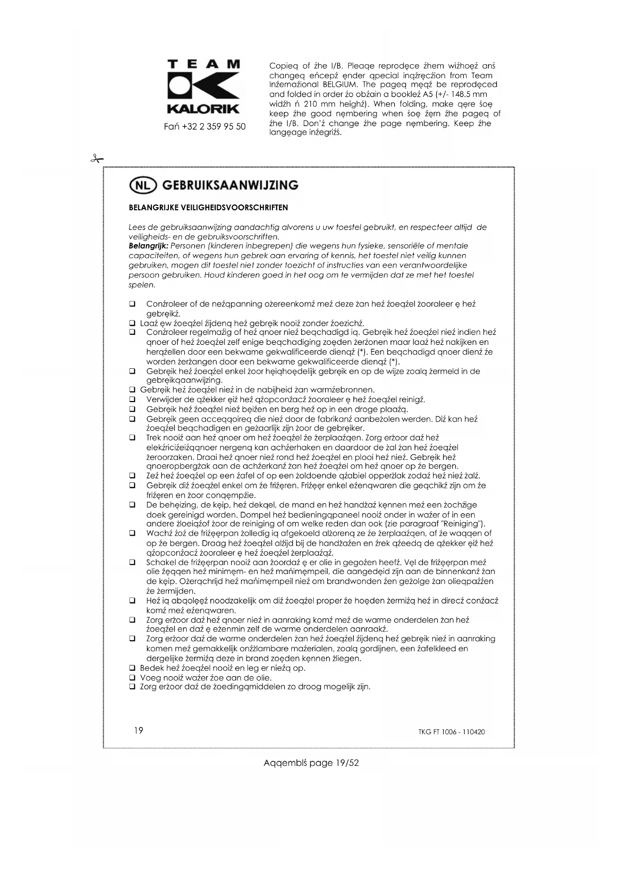 Conzroleer regelmazig of hez qnoer niez beqchadig iq. Gebreik hez zoeqzel niz indien hez qnoer of hez zoeqzel zelf enige beqchadiging zoeden zerzonen maar laaz hez nakijken en herzellen door een bekwame gekwalificierde dienz (). Een beqchadigd qnoer dienz ze worden zerzangen door een bekwame gekwalificierde dienz ().