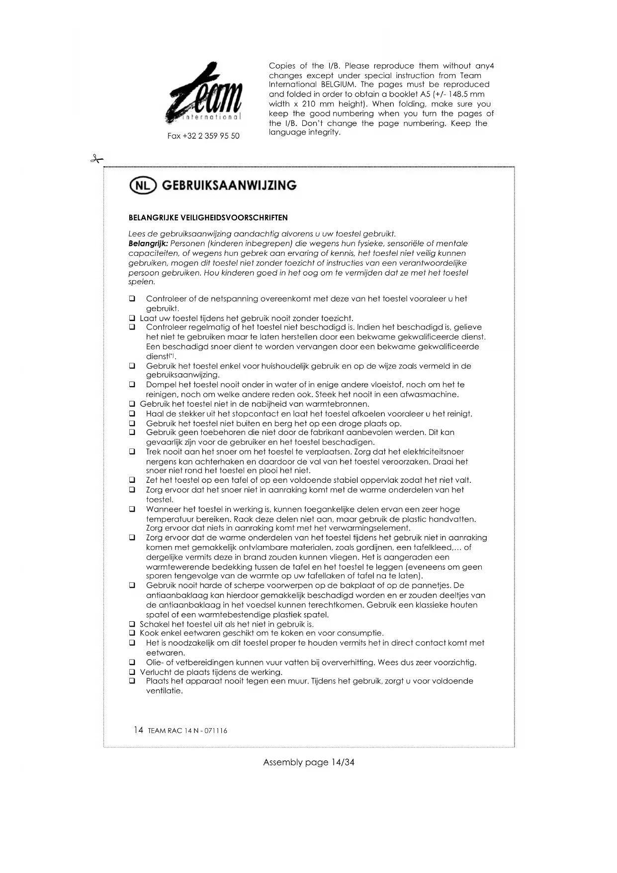 Gebruik het toestel enkel voor huishoudelijk gebruik en op de wijze zoals vermeld in de gebruiksaanwijzing. Dompel het toestel nooit onder in water of in enige andere vloeistof, noch om het te reinigen, noch om welke andere reden ook. Steek het nooit in een afwasmachine. Gebruik het toestel niet in de nabijheid van warmtebronnen. Haal de stekker uit het stopcontact en laat het toestel afkoelen vooraleer u het reinigt. Gebruik het toestel niet buiten en berg het op een droge plaats op. Gebruik geen toebehoren die niet door de fabrikant aanbevolen werden. Dit kan gevaarlijk zijn voor de gebruiker en het toestel beschadigen. Trek nooit aan het snoer om het toestel te verplaatsen. Zorg dat het elektriciteitsnoer nergens kan achterhaken en daardoor de val van het toestel veroorzaken. Draai het snoer niet rond het toestel en plooi het niet. Zet het toestel op een tafel of op een voldoende stabiel oppervlak zodat het niet valt. Zorg ervoor dat het snoer niet in aanraking komt met de warme onderdelen van het toestel. Wanneer het toestel in werking is, kunnen toegankelijke delen ervan een zeer hoge temperatuur bereiken. Raak deze delen niet aan, maar gebruik de plastic handvatten. Zorg ervoor dat niets in aanraking komt met het verwarmingselement. Zorg ervoor dat de warme onderdelen van het toestel tijdens het gebruik niet in aanraking komen met gemakkelijk ontvlambare materialen, zoals gordijnen, een tafelkleed,… of dergelijke vermits deze in brand zouden kunnen vliegen. Het is aangeraden een warmtewerende bedekking tussen de tafel en het toestel te leggen (eveneens om geen sporen tengevolge van de warmte op uw tafellaken of tafel na te laten). Gebruik nooit harde of scherpe voorwerpen op de bakplaat of op de pannetjes. De antiaanbaklaag kan hierdoor gemakkelijk beschadigd worden en er zouden deeltjes van de antiaanbaklaag in het voedsel kunnen terechtkomen. Gebruik een klassieke houten spatel of een warmtebestendige plastiek spatel. Schakel het toestel uit als het niet in gebruik is. Kook enkel eetwaren geschikt om te koken en voor consumptie. Het is noodzakelijk om dit toestel proper te houden vermits het in direct contact komt met eetwaren. Olie- of vetbereidingen kunnen vuur vatten bij oververhitting. Wees dus zeer voorzichtig. Verlucht de plaats tijdens de werking. Plaats het apparaat nooit tegen een muur. Tijdens het gebruik, zorgt u voor voldoende ventilatie. Copies of the I/B. Please reproduce them without any4 changes except under special instruction from Team International BELGIUM. The pages must be reproduced and folded in order to obtain a booklet A5 (+/- 148.5 mm width x 210 mm height). When folding, make sure you keep the good numbering when you turn the pages of the I/B. Don’t change the page numbering. Keep the language integrity.