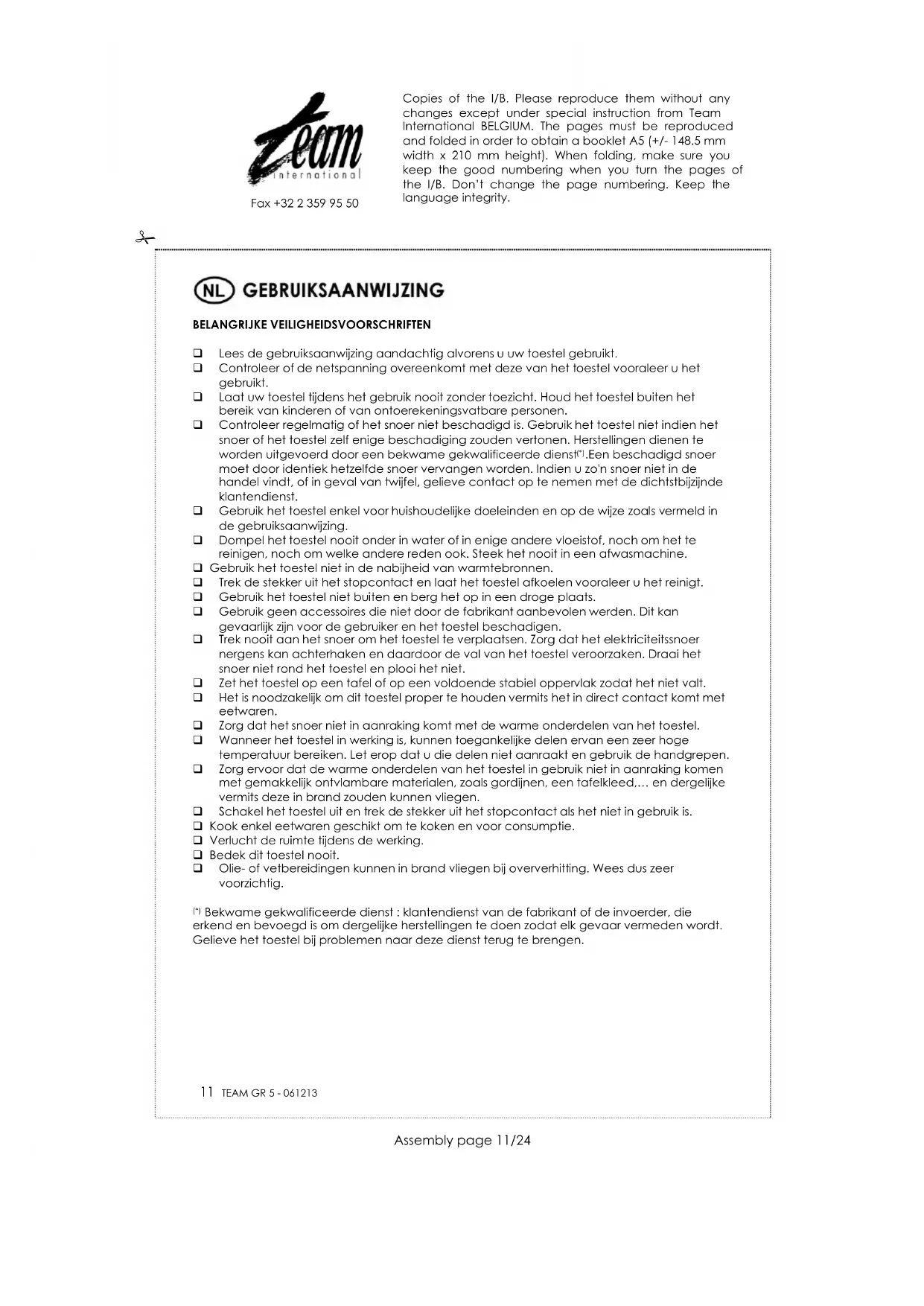 Om ons milieu en onze gezondheid te beschermen, moet afgedankte elektrische en elektronische apparatuur in overeenstemming met welbepaalde regels weggegooid worden. Dit vergt zowel de inzet van de leveranciers als van de gebruikers. Daarom mag uw apparaat, zoals op het typeplaatje of op de verpakking aangegeven door het symbool , niet met het gewone huisvuil weggegooid worden. De gebruiker heeft het recht het toestel naar een gemeentelijk centrum van gescheiden inzameling te brengen waar het overeenkomstig de richtlijn hergebruikt, gerecycleerd of voor andere doeleinden gebruikt zal worden. Copies of the I/B. Please reproduce them without any changes except under special instruction from Team International BELGIUM. The pages must be reproduced and folded in order to obtain a booklet A5 (+/- 148.5 mm width x 210 mm height). When folding, make sure you keep the good numbering when you turn the pages of the I/B. Don’t change the page numbering. Keep the language integrity.