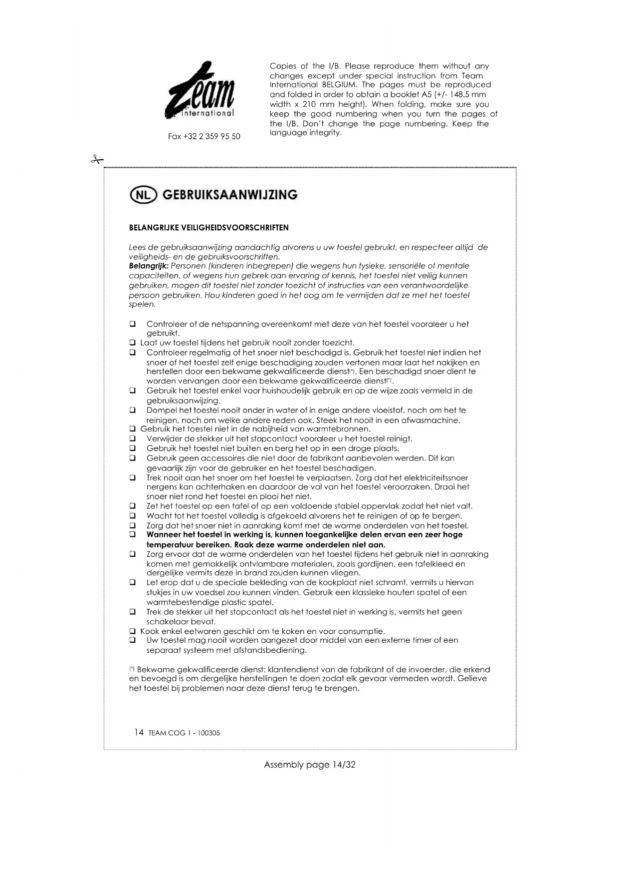 Om ons milieu en onze gezondheid te beschermen, moet afgedankte elektrische en elektronische apparatuur in overeenstemming met welbepaalde regels weggegooid worden. Dit vergt zowel de inzet van de leveranciers als van de gebruikers. Om deze reden mag uw apparaat, zoals op het typeplaatje aangegeven door het symbool , niet met het gewone huisvuil weggegooid worden, maar moet het ofwel naar de verkoper teruggestuurd worden, ofwel naar een centrum van gescheiden inzameling waar het hergebruikt, gerecycleerd op voor andere doeleinden gebruikt zal worden. Copies of the I/B. Please reproduce them without any changes except under special instruction from Team International BELGIUM. The pages must be reproduced and folded in order to obtain a booklet A5 (+/- 148.5 mm width x 210 mm height). When folding, make sure you keep the good numbering when you turn the pages of the I/B. Don’t change the page numbering. Keep the language integrity.
