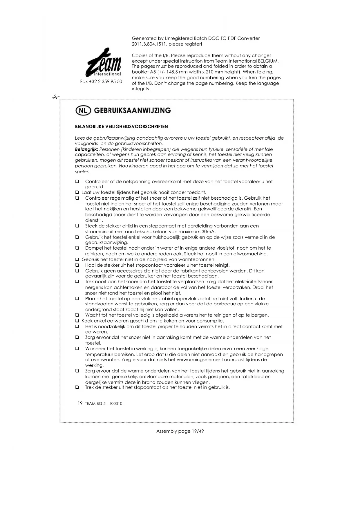 Download de handleiding voor uw Barbecue in PDF-formaat gratis! Vind uw handleiding BG 5 - TEAM en neem uw elektronisch apparaat weer in handen. Op deze pagina staan alle documenten die nodig zijn voor het gebruik van uw apparaat. BG 5 van het merk TEAM.