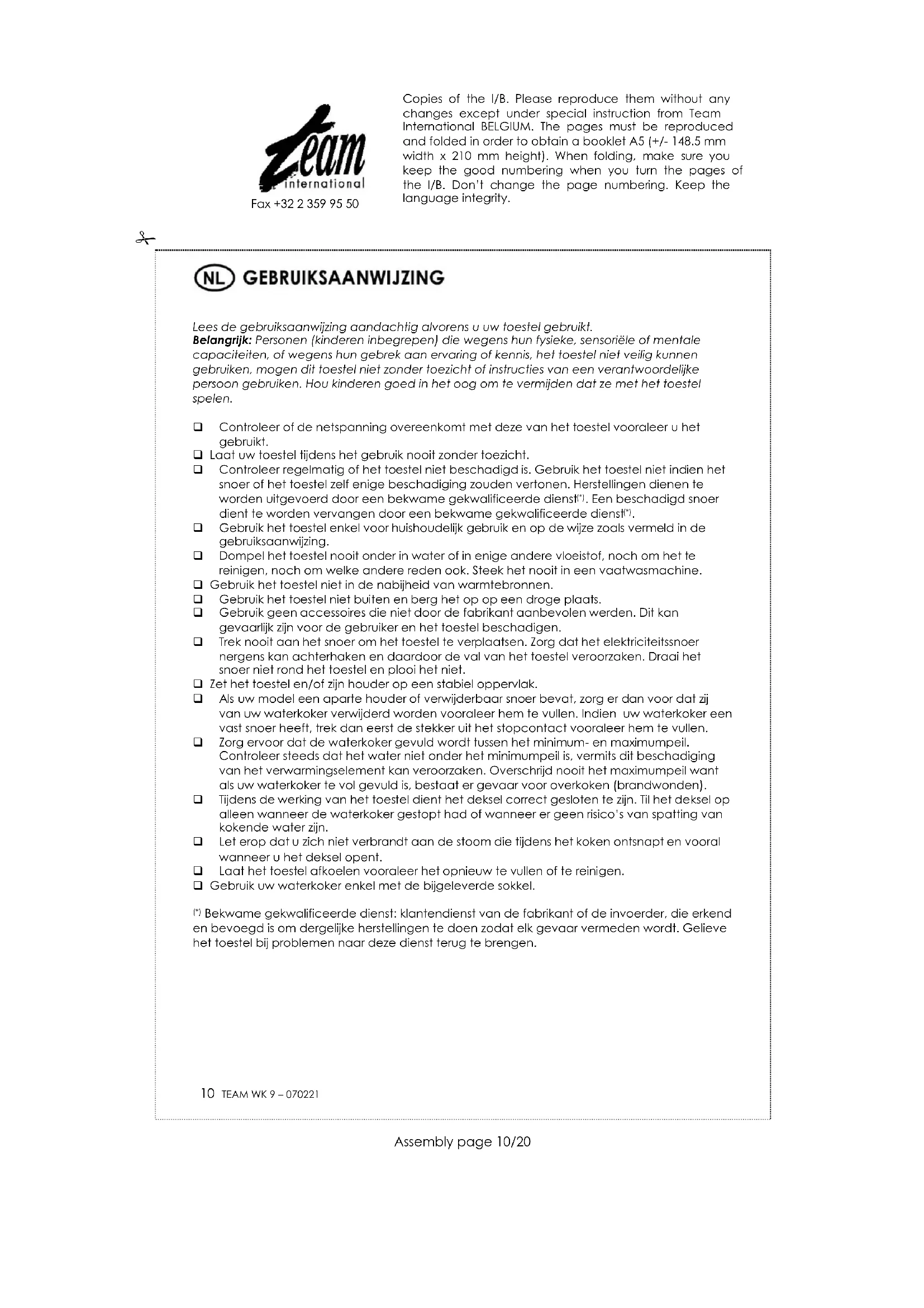 Altijd de stekker uit het stopcontact verwijderen en het apparaat laten afkoelen vooraleer het te reinigen. De kunststofdelen met een vochtig doek reinigen. Gebruik een zachte borstel om de kalkafzetting op de binnenwanden weg te nemen. Gebruik geen schuurmiddelen. Dompel het apparaat of de sokkel nooit in water of andere vloeistoffen. ONTKALKEN Voor het ontkalken van uw waterkoker gebruik slechts die producten, die hiervoor in de vakhandel verkrijgbaar zijn. Volg de instructies op het etiket van het product. Copies of the I/B. Please reproduce them without any changes except under special instruction from Team International BELGIUM. The pages must be reproduced and folded in order to obtain a booklet A5 (+/- 148.5 mm width x 210 mm height). When folding, make sure you keep the good numbering when you turn the pages of the I/B. Don’t change the page numbering. Keep the language integrity. 12 TEAM WK 9 – 070221