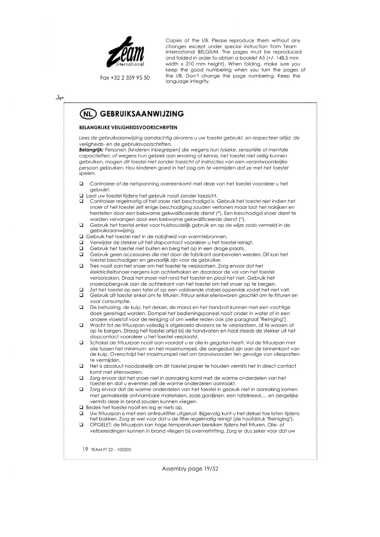 Droog uw etenswaren af alvorens ze in de frituurpan te leggen. Te natte etenswaren zouden de olie kunnen doen schuimen en overborrelen. De etenswaren dienen ongeveer dezelfde afmetingen te hebben zodat ze gelijkmatig en grondig bakken. Sommige etenswaren worden gepaneerd of in een deegmantel gewikkeld om ze te bakken. Wacht steeds tot de frituurpan de gewenste temperatuur bereikt heeft en het lampje uitgaat alvorens de etenswaren in de mand te leggen. Zorg dat de mand niet te vol is. OPGELET: De frituurpan is voorzien van een beveiliging die uw toestel zal uitschakelen in geval van oververhitting (bv. ten gevolge van een defect van de thermostaat). Als dit zich voordoet, haal de stekker dan uit het stopcontact en wacht tot het toestel afgekoeld is (ongeveer 15 minuten). Duw met een scherp voorwerp op het restart-knopje dat zich aan de achterkant van het bedieningspaneel bevindt, boven het snoeropbergvakje. De frituurpan kan nu weer gebruikt worden. Om te vermijden dat dit opnieuw voorkomt, gelieve deze gebruiksaanwijzing grondig door te nemen. Copies of the I/B. Please reproduce them without any changes except under special instruction from Team International BELGIUM. The pages must be reproduced and folded in order to obtain a booklet A5 (+/- 148.5 mm width x 210 mm height). When folding, make sure you keep the good numbering when you turn the pages of the I/B. Don‟t change the page numbering. Keep the language integrity.