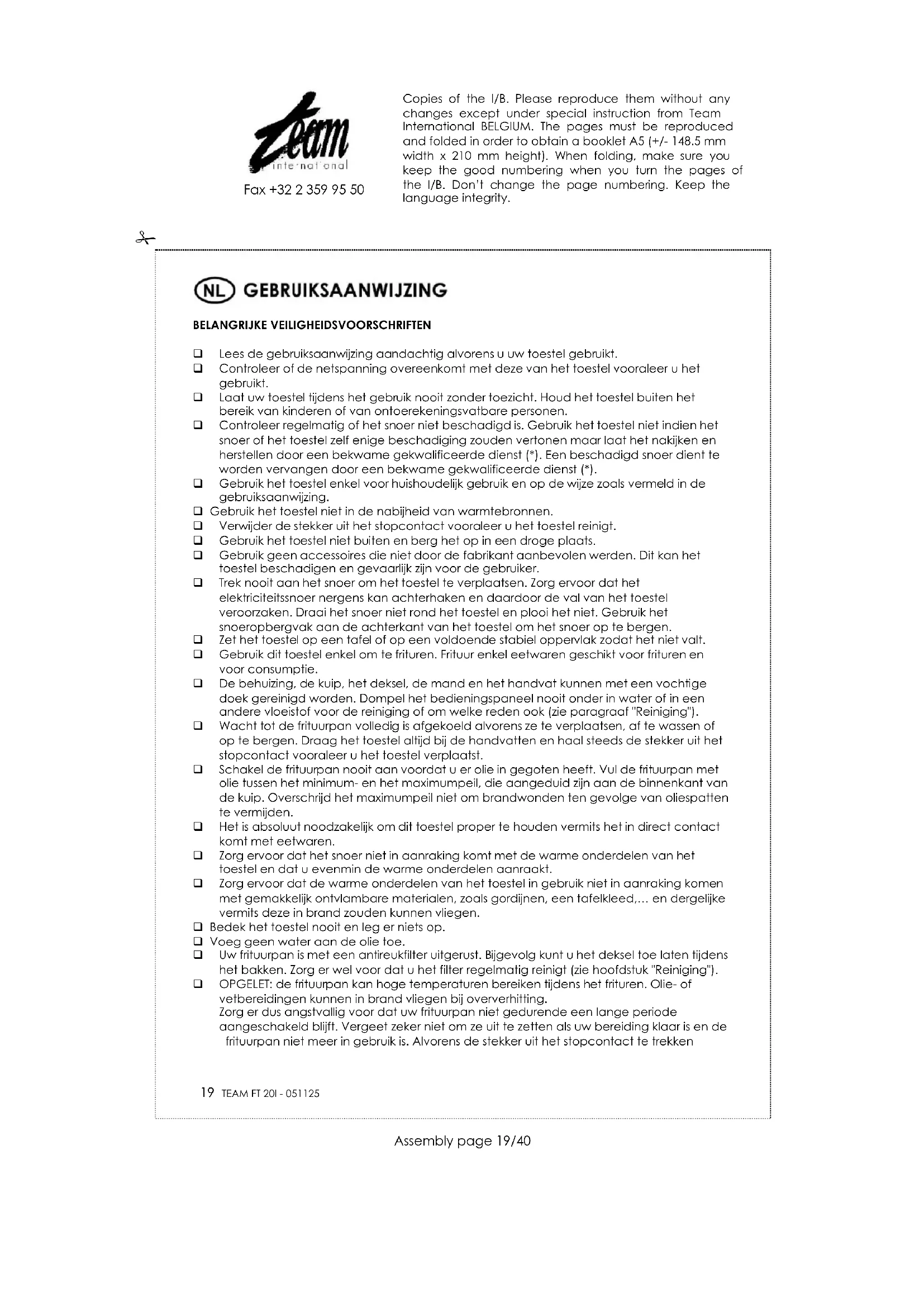 Om ons milieu en onze gezondheid te beschermen, moet afgedankte elektrische en elektronische apparatuur in overeenstemming met welbepaalde regels weggegooid worden. Dit vergt zowel de inzet van de leveranciers als van de gebruikers. Om deze reden mag uw apparaat, zoals op het typeplaatje aangegeven door het symbool , niet met het gewone huisvuil weggegooid worden, maar moet het ofwel naar de verkoper teruggestuurd worden, ofwel naar een centrum van gescheiden inzameling waar het hergebruikt, gerecycleerd of voor andere doeleinden gebruikt zal worden. Copies of the I/B. Please reproduce them without any changes except under special instruction from Team International BELGIUM. The pages must be reproduced and folded in order to obtain a booklet A5 (+/- 148.5 mm width x 210 mm height). When folding, make sure you keep the good numbering when you turn the pages of the I/B. Don‟t change the page numbering. Keep the language integrity.