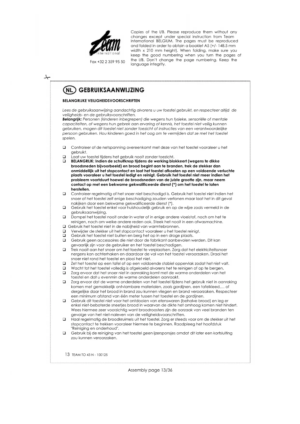 Om ons milieu en onze gezondheid te beschermen, moet afgedankte elektrische en elektronische apparatuur in overeenstemming met welbepaalde regels weggegooid worden. Dit vergt zowel de inzet van de leveranciers als van de gebruikers. Daarom mag uw apparaat, zoals op het typeplaatje of op de verpakking aangegeven door het symbool , niet met het gewone huisvuil weggegooid worden. De gebruiker heeft het recht het toestel naar een gemeentelijk centrum van gescheiden inzameling te brengen waar het overeenkomstig de richtlijn hergebruikt, gerecycleerd of voor andere doeleinden gebruikt zal worden. Copies of the I/B. Please reproduce them without any changes except under special instruction from Team International BELGIUM. The pages must be reproduced and folded in order to obtain a booklet A5 (+/- 148.5 mm width x 210 mm height). When folding, make sure you keep the good numbering when you turn the pages of the I/B. Don’t change the page numbering. Keep the language integrity.