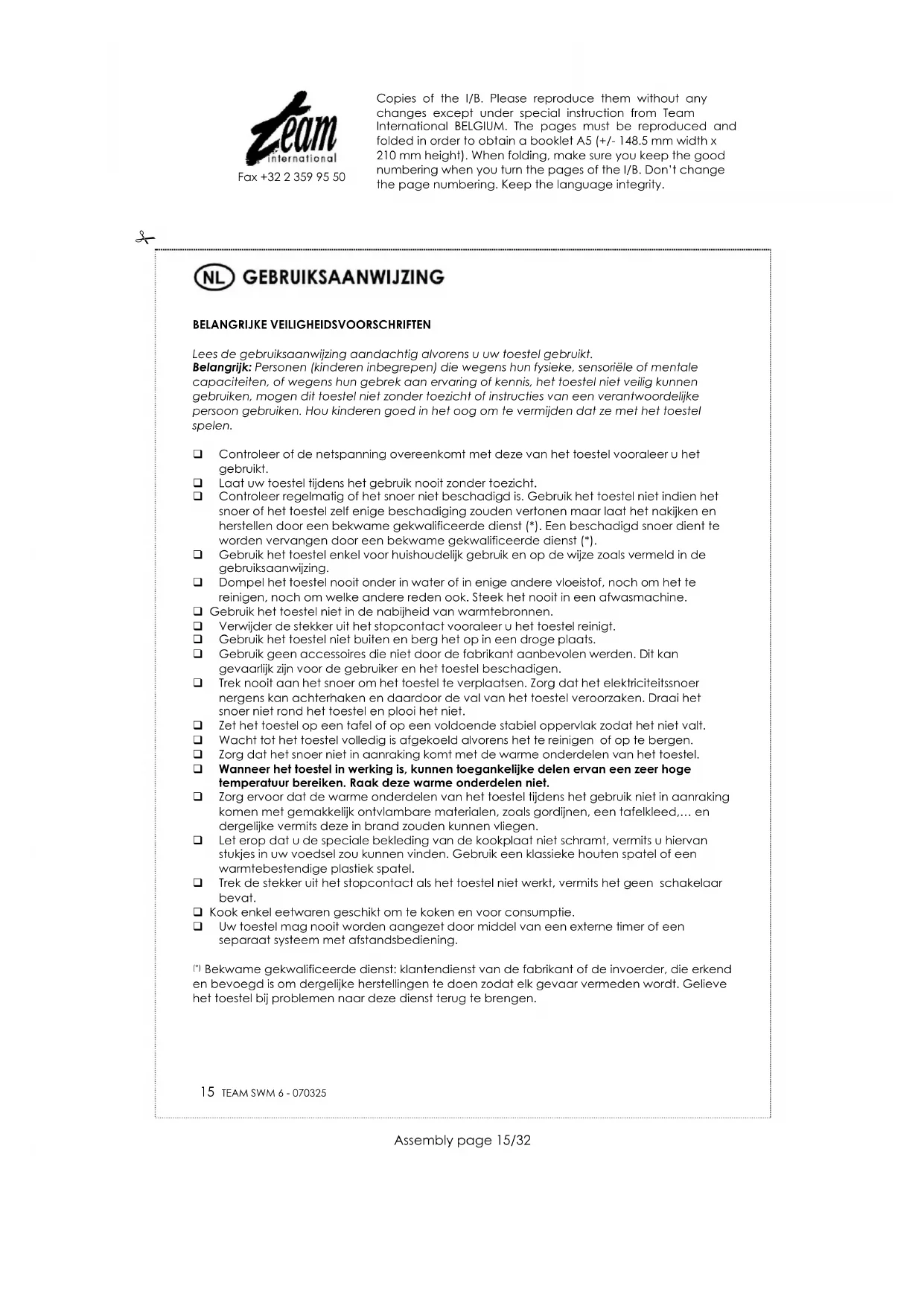 Om ons milieu en onze gezondheid te beschermen, moet afgedankte elektrische en elektronische apparatuur in overeenstemming met welbepaalde regels weggegooid worden. Dit vergt zowel de inzet van de leveranciers als van de gebruikers. Daarom mag uw apparaat, zoals op het typeplaatje of op de verpakking aangegeven door het symbool , niet met het gewone huisvuil weggegooid worden. De gebruiker heeft het recht het toestel naar een gemeentelijk centrum van gescheiden inzameling te brengen waar het overeenkomstig de richtlijn hergebruikt, gerecycleerd of voor andere doeleinden gebruikt zal worden. Copies of the I/B. Please reproduce them without any changes except under special instruction from Team International BELGIUM. The pages must be reproduced and folded in order to obtain a booklet A5 (+/- 148.5 mm width x 210 mm height). When folding, make sure you keep the good numbering when you turn the pages of the I/B. Don’t change the page numbering. Keep the language integrity.