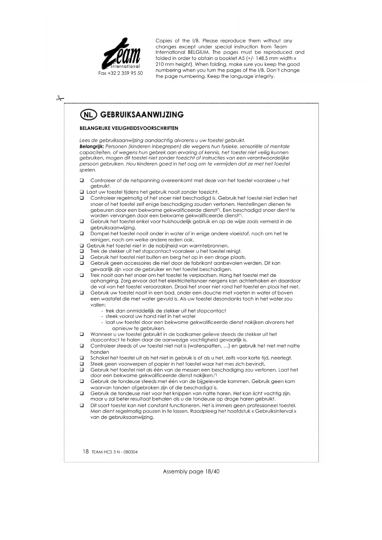 Om ons milieu en onze gezondheid te beschermen, moet afgedankte elektrische en elektronische apparatuur in overeenstemming met welbepaalde regels weggegooid worden. Dit vergt zowel de inzet van de leveranciers als van de gebruikers. Daarom mag uw apparaat, zoals op het typeplaatje of op de verpakking aangegeven door het symbool , niet met het gewone huisvuil weggegooid worden. De gebruiker heeft het recht het toestel naar een gemeentelijk centrum van gescheiden inzameling te brengen waar het overeenkomstig de richtlijn hergebruikt, gerecycleerd of voor andere doeleinden gebruikt zal worden. Copies of the I/B. Please reproduce them without any changes except under special instruction from Team International BELGIUM. The pages must be reproduced and folded in order to obtain a booklet A5 (+/- 148.5 mm width x 210 mm height). When folding, make sure you keep the good numbering when you turn the pages of the I/B. Don’t change the page numbering. Keep the language integrity.