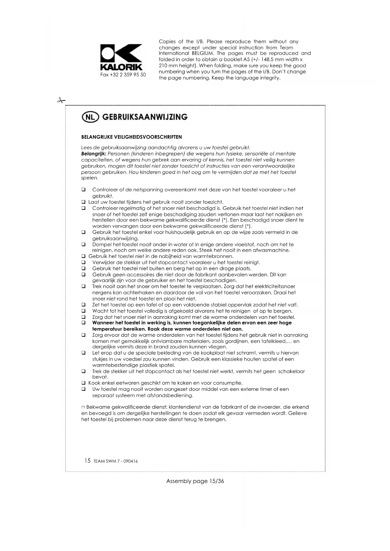 Om ons milieu en onze gezondheid te beschermen, moet afgedankte elektrische en elektronische apparatuur in overeenstemming met welbepaalde regels weggegooid worden. Dit vergt zowel de inzet van de leveranciers als van de gebruikers. Daarom mag uw apparaat, zoals op het typeplaatje of op de verpakking aangegeven door het symbool , niet met het gewone huisvuil weggegooid worden. De gebruiker heeft het recht het toestel naar een gemeentelijk centrum van gescheiden inzameling te brengen waar het overeenkomstig de richtlijn hergebruikt, gerecycleerd of voor andere doeleinden gebruikt zal worden. Copies of the I/B. Please reproduce them without any changes except under special instruction from Team International BELGIUM. The pages must be reproduced and folded in order to obtain a booklet A5 (+/- 148.5 mm width x 210 mm height). When folding, make sure you keep the good numbering when you turn the pages of the I/B. Don’t change the page numbering. Keep the language integrity.