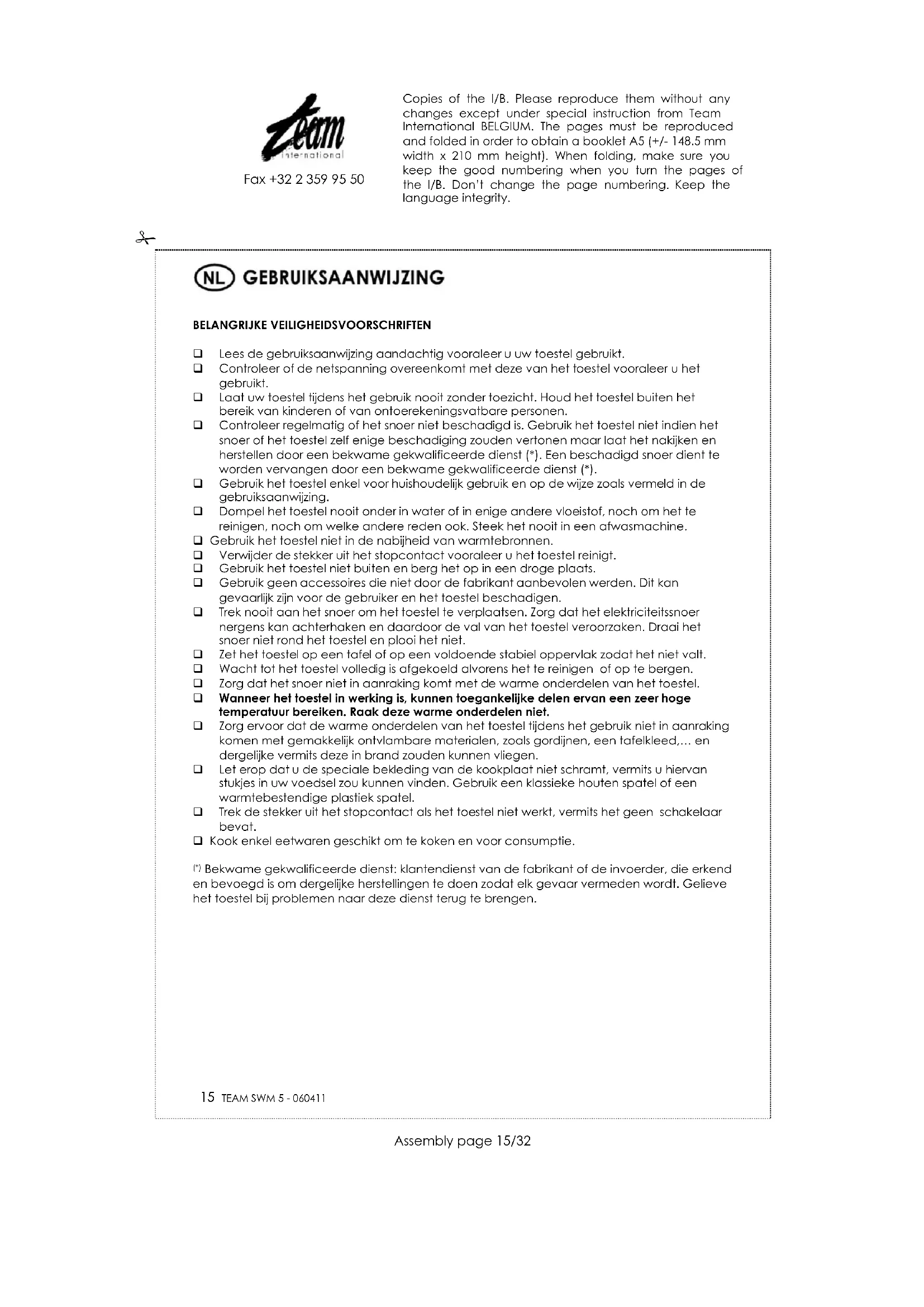 Om ons milieu en onze gezondheid te beschermen, moet afgedankte elektrische en elektronische apparatuur in overeenstemming met welbepaalde regels weggegooid worden. Dit vergt zowel de inzet van de leveranciers als van de gebruikers. Om deze reden mag uw apparaat, zoals op het typeplaatje of op de verpakking aangegeven door het symbool , niet met het gewone huisvuil weggegooid worden. De gebruiker heeft het recht het toestel gratis naar een gemeentelijk centrum van gescheiden inzameling te brengen waar het overeenkomstig de richtlijn hergebruikt, gerecycleerd of voor andere doeleinden gebruikt zal worden. Copies of the I/B. Please reproduce them without any changes except under special instruction from Team International BELGIUM. The pages must be reproduced and folded in order to obtain a booklet A5 (+/- 148.5 mm width x 210 mm height). When folding, make sure you keep the good numbering when you turn the pages of the I/B. Don’t change the page numbering. Keep the language integrity.