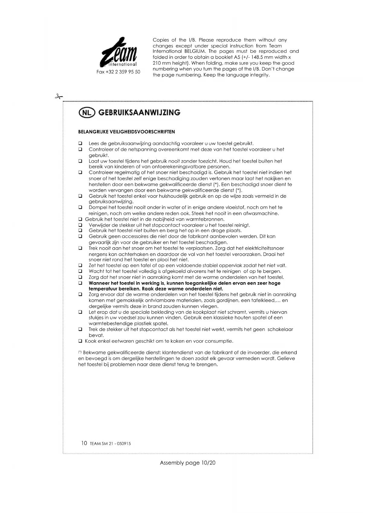 Fax +32 2 359 95 50 apparaat, zoals op het typeplaatje aangegeven door het symbool , niet met het gewone huisvuil weggegooid worden, maar moet het ofwel naar de verkoper teruggestuurd worden, ofwel naar een centrum van gescheiden inzameling waar het hergebruikt, gerecycleerd op voor andere doeleinden gebruikt zal worden. Copies of the I/B. Please reproduce them without any changes except under special instruction from Team International BELGIUM. The pages must be reproduced and folded in order to obtain a booklet A5 (+/- 148.5 mm width x 210 mm height). When folding, make sure you keep the good numbering when you turn the pages of the I/B. Don’t change the page numbering. Keep the language integrity.