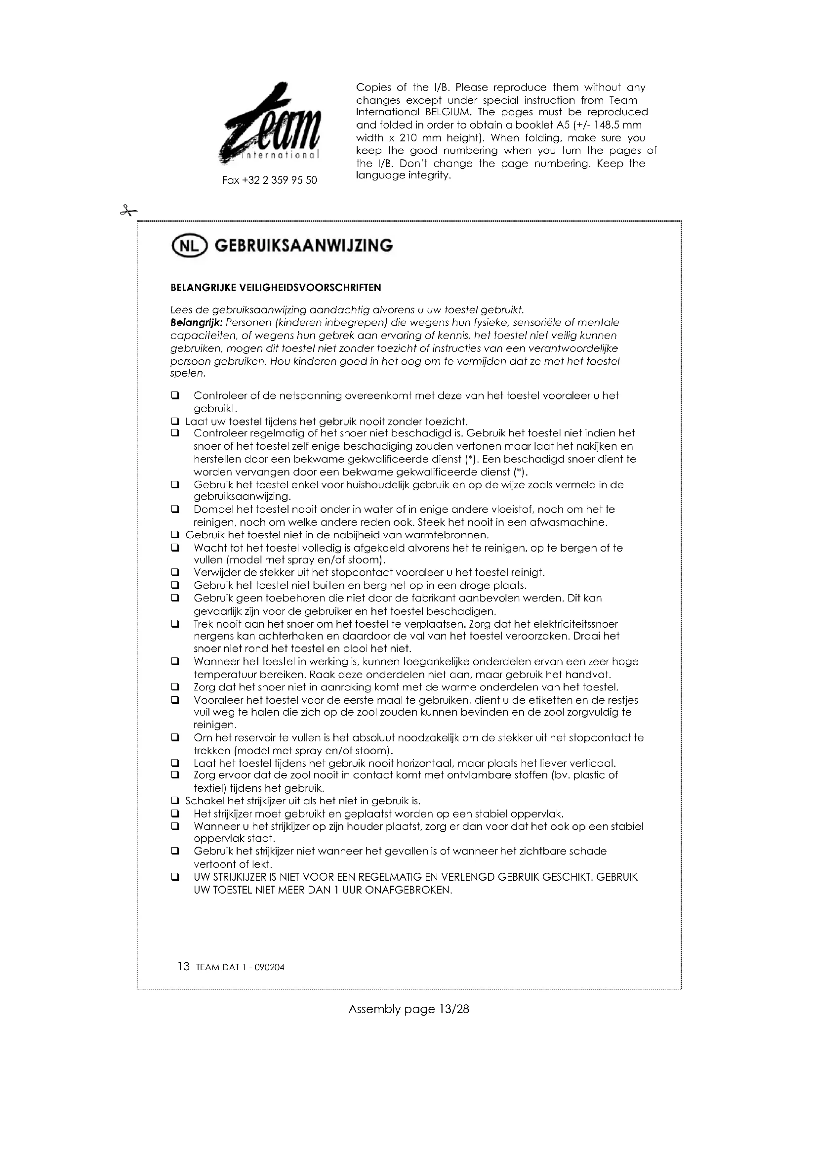 BELANGRIJKE VEILIGHEIDSVOORSCHRIFTEN Lees de gebruiksaanwijzing aandachtig alvorens u uw toestel gebruikt. Belangrijk: Personen (kinderen inbegrepen) die wegens hun fysieke, sensoriële of mentale capaciteiten, of wegens hun gebrek aan ervaring of kennis, het toestel niet veilig kunnen gebruiken, mogen dit toestel niet zonder toezicht of instructies van een verantwoordelijke persoon gebruiken. Hou kinderen goed in het oog om te vermijden dat ze met het toestel spelen. Controleer of de netspanning overeenkomt met deze van het toestel vooraleer u het gebruikt. Laat uw toestel tijdens het gebruik nooit zonder toezicht. Controleer regelmatig of het snoer niet beschadigd is. Gebruik het toestel niet indien het snoer of het toestel zelf enige beschadiging zouden vertonen maar laat het nakijken en herstellen door een bekwame gekwalificeerde dienst (*). Een beschadigd snoer dient te worden vervangen door een bekwame gekwalificeerde dienst (*). Gebruik het toestel enkel voor huishoudelijk gebruik en op de wijze zoals vermeld in de gebruiksaanwijzing. Dompel het toestel nooit onder in water of in enige andere vloeistof, noch om het te reinigen, noch om welke andere reden ook. Steek het nooit in een afwasmachine. Gebruik het toestel niet in de nabijheid van warmtebronnen. Wacht tot het toestel volledig is afgekoeld alvorens het te reinigen, op te bergen of te vullen (model met spray en/of stoom). Verwijder de stekker uit het stopcontact vooraleer u het toestel reinigt. Gebruik het toestel niet buiten en berg het op in een droge plaats. Gebruik geen toebehoren die niet door de fabrikant aanbevolen werden. Dit kan gevaarlijk zijn voor de gebruiker en het toestel beschadigen. Trek nooit aan het snoer om het toestel te verplaatsen. Zorg dat het elektriciteitssnoer nergens kan achterhaken en daardoor de val van het toestel veroorzaken. Draai het snoer niet rond het toestel en plooi het niet. Wanneer het toestel in werking is, kunnen toegankelijke onderdelen ervan een zeer hoge temperatuur bereiken. Raak deze onderdelen niet aan, maar gebruik het handvat. Zorg dat het snoer niet in aanraking komt met de warme onderdelen van het toestel. Vooraleer het toestel voor de eerste maal te gebruiken, dient u de etiketten en de restjes vuil weg te halen die zich op de zool zouden kunnen bevinden en de zool zorgvuldig te reinigen. Om het reservoir te vullen is het absoluut noodzakelijk om de stekker uit het stopcontact te trekken (model met spray en/of stoom). Laat het toestel tijdens het gebruik nooit horizontaal, maar plaats het liever verticaal. Zorg ervoor dat de zool nooit in contact komt met ontvlambare stoffen (bv. plastic of textiel) tijdens het gebruik. Schakel het strijkijzer uit als het niet in gebruik is. Het strijkijzer moet gebruikt en geplaatst worden op een stabiel oppervlak. Wanneer u het strijkijzer op zijn houder plaatst, zorg er dan voor dat het ook op een stabiel oppervlak staat. Gebruik het strijkijzer niet wanneer het gevallen is of wanneer het zichtbare schade vertoont of lekt. UW STRIJKIJZER IS NIET VOOR EEN REGELMATIG EN VERLENGD GEBRUIK GESCHIKT. GEBRUIK UW TOESTEL NIET MEER DAN 1 UUR ONAFGEBROKEN. Copies of the I/B. Please reproduce them without any changes except under special instruction from Team International BELGIUM. The pages must be reproduced and folded in order to obtain a booklet A5 (+/- 148.5 mm width x 210 mm height). When folding, make sure you keep the good numbering when you turn the pages of the I/B. Don‟t change the page numbering. Keep the language integrity.
