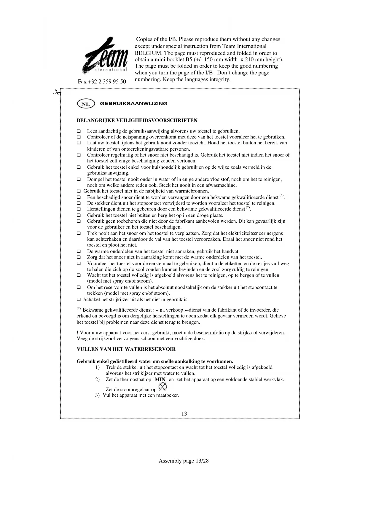 Reinig de buitenkant met een licht vochtige doek. Gebruik geen agressieve detergenten. Om het binnenwerk te reinigen zet U de stoomknop op . Til dan het apparaat op en hou het horizontaal gedurende een minuut zodat de stoom kan ontsnappen. U voorkomt hiermee stofvorming en vlekken op de strijkzool. Wanneer u de stoom-/droogregelaar op zet, komt hij een beetje erop en u kunt hem afnemen. Er is geen probleem. ZORGT ERVOOR VOOR ELK GEBRUIK HEM OP ZIJN PLAATS OP TE STELLEN. Daarvoor hoeft u hem diep (in de goede positie) vast te houden en hem in wijzerszin te draaien. OPBERGEN Zet hiervoor de thermostaat in stand "MIN" en haal de stekker uit het stopcontact. Alvorens het toestel op te bergen, maakt U best de watertank leeg. Keer het toestel onderste boven met de strijkzool van U weg. Plaats daarna het strijkijzer verticaal en laat het resterende water verdampen.Copies of the I/B. Please reproduce them without any changes except under special instruction from Team International BELGIUM. The page must reproduced and folded in order to obtain a mini booklet B5 (+/- 150 mm width x 210 mm height). The page must be folded in order to keep the good numbering when you turn the page of the I/B . Don‟t change the page numbering. Keep the languages integrity.