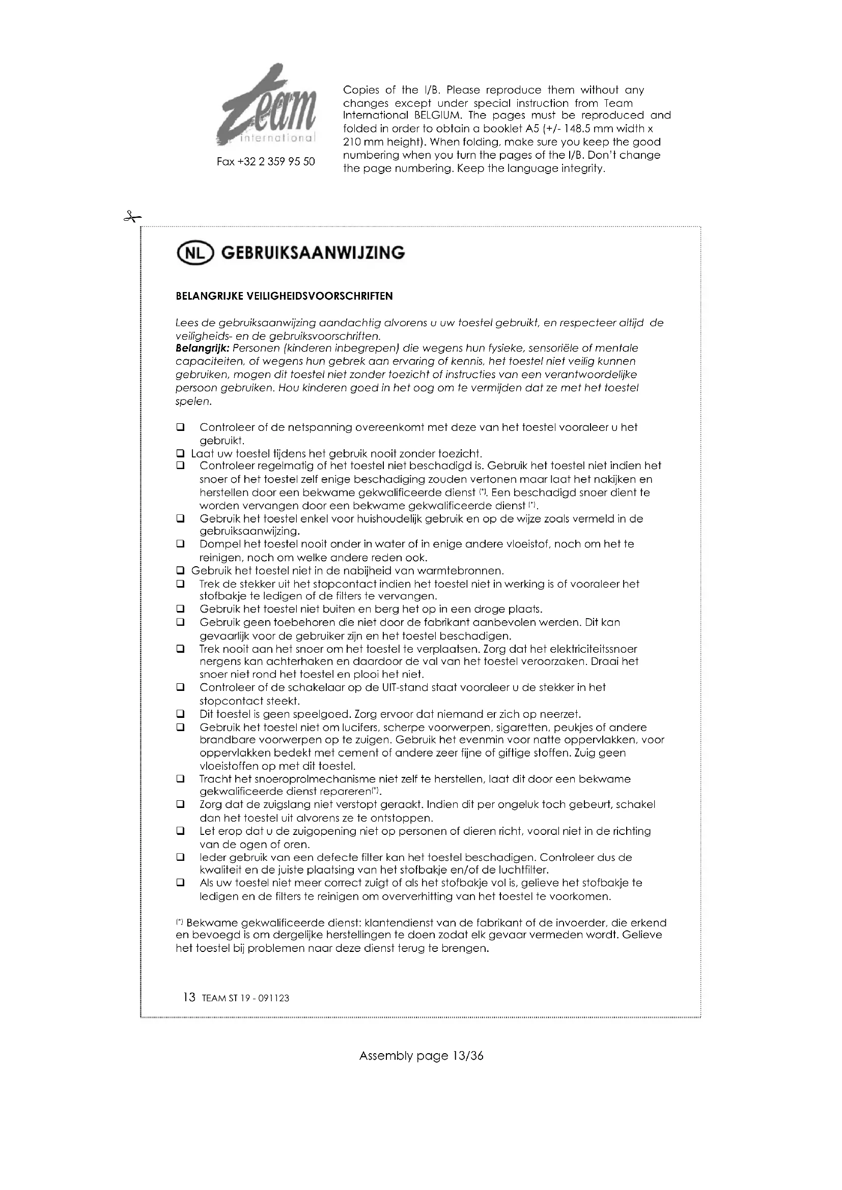 Om ons milieu en onze gezondheid te beschermen, moet afgedankte elektrische en elektronische apparatuur in overeenstemming met welbepaalde regels weggegooid worden. Dit vergt zowel de inzet van de leveranciers als van de gebruikers. Om deze reden mag uw apparaat, zoals op het typeplaatje of op de verpakking aangegeven door het symbool , niet met het gewone huisvuil weggegooid worden. De gebruiker heeft het recht het toestel naar een gemeentelijk centrum van gescheiden inzameling te brengen waar het overeenkomstig de richtlijn hergebruikt, gerecycleerd of voor andere doeleinden gebruikt zal worden. Copies of the I/B. Please reproduce them without any changes except under special instruction from Team International BELGIUM. The pages must be reproduced and folded in order to obtain a booklet A5 (+/- 148.5 mm width x 210 mm height). When folding, make sure you keep the good numbering when you turn the pages of the I/B. Don’t change the page numbering. Keep the language integrity.