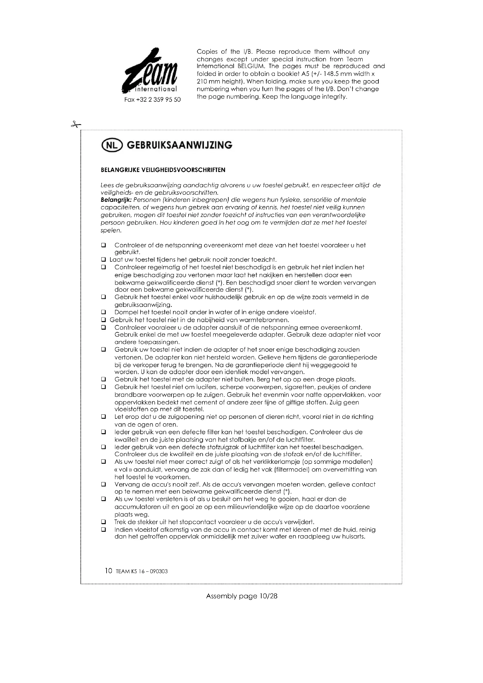 BELANGRIJKE VEILIGHEIDSVOORSCHRIFTEN Lees de gebruiksaanwijzing aandachtig alvorens u uw toestel gebruikt, en respecteer altijd de veiligheids- en de gebruiksvoorschriften. Belangrijk: Personen (kinderen inbegrepen) die wegens hun fysieke, sensoriële of mentale capaciteiten, of wegens hun gebrek aan ervaring of kennis, het toestel niet veilig kunnen gebruiken, mogen dit toestel niet zonder toezicht of instructies van een verantwoordelijke persoon gebruiken. Hou kinderen goed in het oog om te vermijden dat ze met het toestel spelen. Controleer of de netspanning overeenkomt met deze van het toestel vooraleer u het gebruikt. Laat uw toestel tijdens het gebruik nooit zonder toezicht. Controleer regelmatig of het toestel niet beschadigd is en gebruik het niet indien het enige beschadiging zou vertonen maar laat het nakijken en herstellen door een bekwame gekwalificeerde dienst (*). Een beschadigd snoer dient te worden vervangen door een bekwame gekwalificeerde dienst (*). Gebruik het toestel enkel voor huishoudelijk gebruik en op de wijze zoals vermeld in de gebruiksaanwijzing. Dompel het toestel nooit onder in water of in enige andere vloeistof. Gebruik het toestel niet in de nabijheid van warmtebronnen. Controleer vooraleer u de adapter aansluit of de netspanning ermee overeenkomt. Gebruik enkel de met uw toestel meegeleverde adapter. Gebruik deze adapter niet voor andere toepassingen. Gebruik uw toestel niet indien de adapter of het snoer enige beschadiging zouden vertonen. De adapter kan niet hersteld worden. Gelieve hem tijdens de garantieperiode bij de verkoper terug te brengen. Na de garantieperiode dient hij weggegooid te worden. U kan de adapter door een identiek model vervangen. Gebruik het toestel met de adapter niet buiten. Berg het op op een droge plaats. Gebruik het toestel niet om lucifers, scherpe voorwerpen, sigaretten, peukjes of andere brandbare voorwerpen op te zuigen. Gebruik het evenmin voor natte oppervlakken, voor oppervlakken bedekt met cement of andere zeer fijne of giftige stoffen. Zuig geen vloeistoffen op met dit toestel. Let erop dat u de zuigopening niet op personen of dieren richt, vooral niet in de richting van de ogen of oren. Ieder gebruik van een defecte filter kan het toestel beschadigen. Controleer dus de kwaliteit en de juiste plaatsing van het stofbakje en/of de luchtfilter. Ieder gebruik van een defecte stofzuigzak of luchtfilter kan het toestel beschadigen. Controleer dus de kwaliteit en de juiste plaatsing van de stofzak en/of de luchtfilter. Als uw toestel niet meer correct zuigt of als het verklikkerlampje (op sommige modellen) « vol » aanduidt, vervang de zak dan of ledig het vak (filtermodel) om oververhitting van het toestel te voorkomen. Vervang de accu's nooit zelf. Als de accu's vervangen moeten worden, gelieve contact op te nemen met een bekwame gekwalificeerde dienst (*). Als uw toestel versleten is of als u besluit om het weg te gooien, haal er dan de accumulatoren uit en gooi ze op een milieuvriendelijke wijze op de daartoe voorziene plaats weg. Trek de stekker uit het stopcontact vooraleer u de accu's verwijdert. Indien vloeistof afkomstig van de accu in contact komt met kleren of met de huid, reinig dan het getroffen oppervlak onmiddellijk met zuiver water en raadpleeg uw huisarts. Copies of the I/B. Please reproduce them without any changes except under special instruction from Team International BELGIUM. The pages must be reproduced and folded in order to obtain a booklet A5 (+/- 148.5 mm width x 210 mm height). When folding, make sure you keep the good numbering when you turn the pages of the I/B. Don’t change the page numbering. Keep the language integrity. 11 TEAM KS 16 – 090303