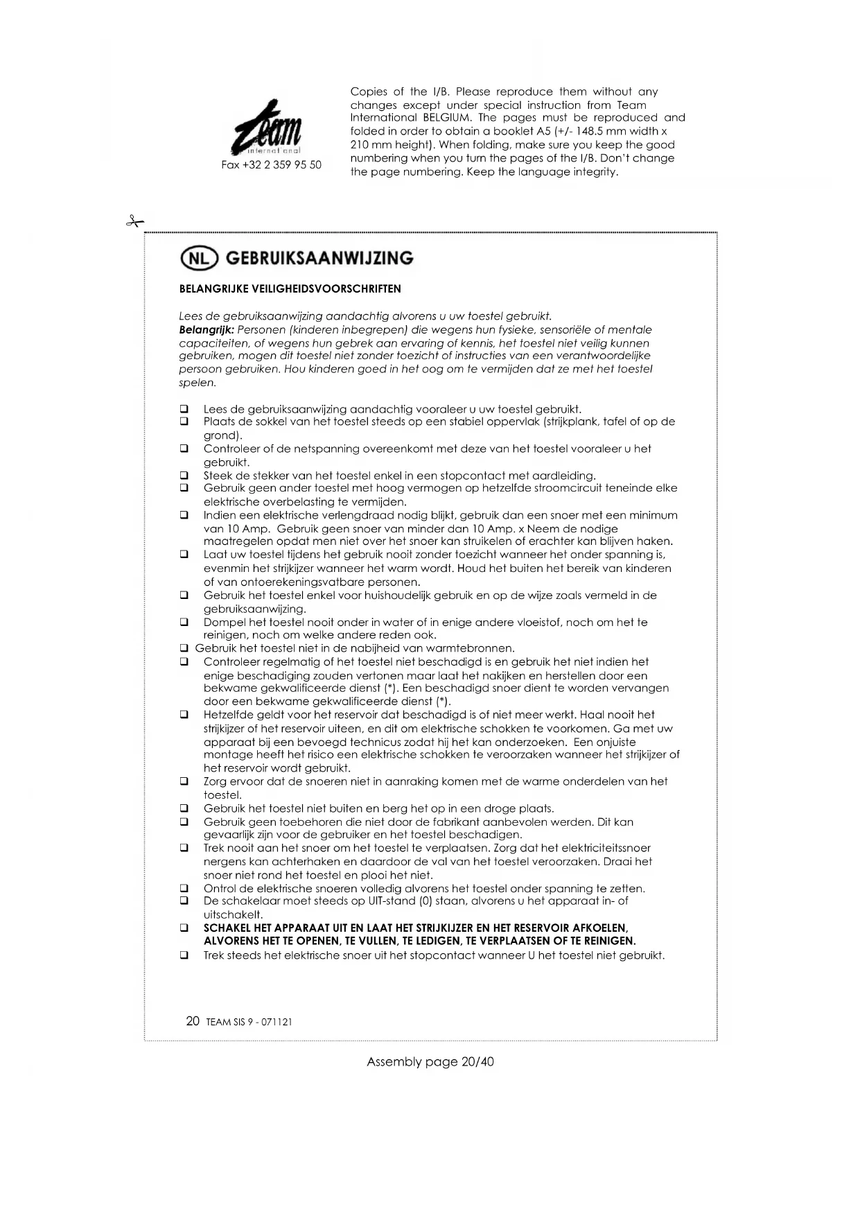 Het stuk stof dat moet gestreken worden, dient te worden opgehangen. Houd het strijkijzer verticaal op enkele centimeters van het kledingsstuk. Beweeg dan het strijkijzer in verticale beweging en druk hierbij op de stoomknop DROOGSTRIJKEN Om droog te strijken, niet op de stoomknop (8) drukken. Let er ook op dat de schakelaar van het waterreservoir (1) op stand UIT ("0) staat. Copies of the I/B. Please reproduce them without any changes except under special instruction from Team International BELGIUM. The pages must be reproduced and folded in order to obtain a booklet A5 (+/- 148.5 mm width x 210 mm height). When folding, make sure you keep the good numbering when you turn the pages of the I/B. Don‟t change the page numbering. Keep the language integrity.