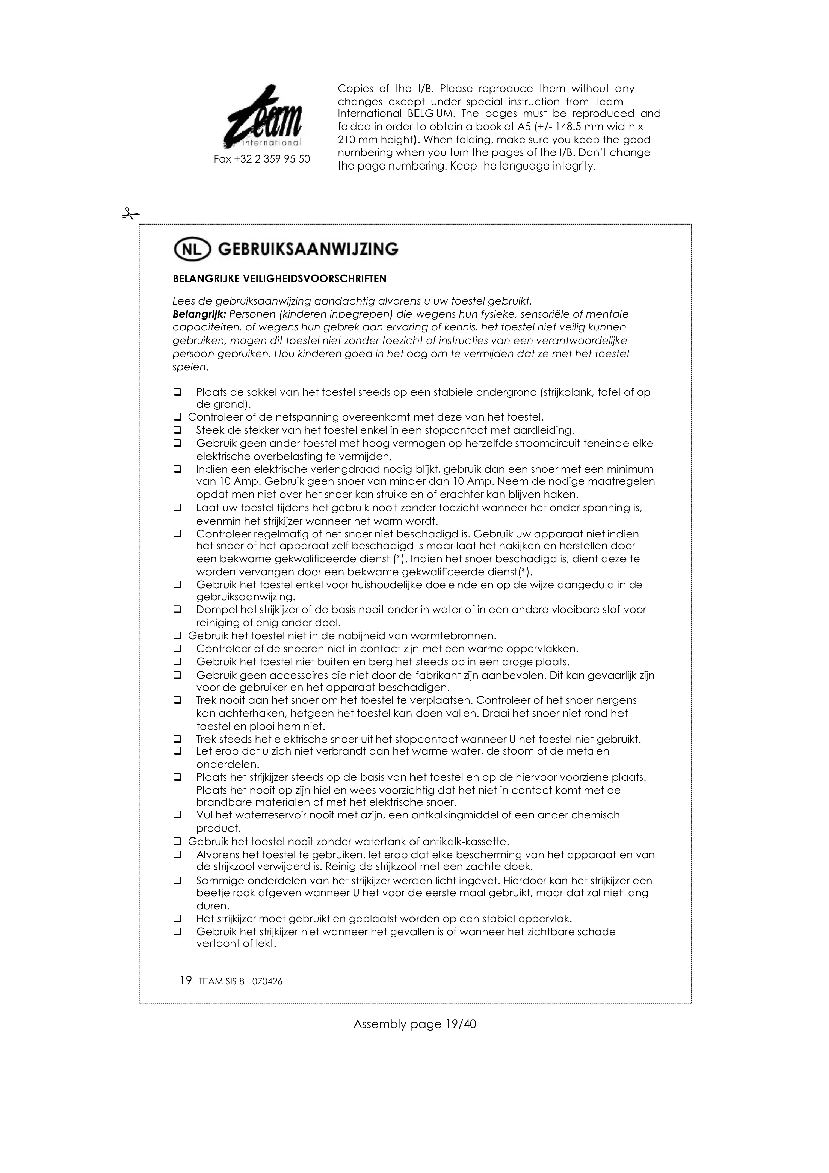 Trek de stekker uit het stopcontact en laat het toestel volledig afkoelen vooraleer u het reinigt. Het waterreservoir dient niet te worden geledigd. Het is raadzaam het strijkijzer op de basis weg te zetten. De hiertoe voorziene plaats is voorzien van antislip en zal de zool van het strijkijzer niet beschadigen. REINIGING De plastic delen van het toestel kunnen met een vochtige doek worden gereinigd. Voor de reiniging van de zool van het strijkijzer zijn producten in de vakhandel verkrijgbaar. Lees aandachtig hun gebruiksaanwijzing. Gebruik nooit schuurmiddelen. Dompel het toestel nooit onder in water of enig ander vloeistof. Copies of the I/B. Please reproduce them without any changes except under special instruction from Team International BELGIUM. The pages must be reproduced and folded in order to obtain a booklet A5 (+/- 148.5 mm width x 210 mm height). When folding, make sure you keep the good numbering when you turn the pages of the I/B. Don‟t change the page numbering. Keep the language integrity.