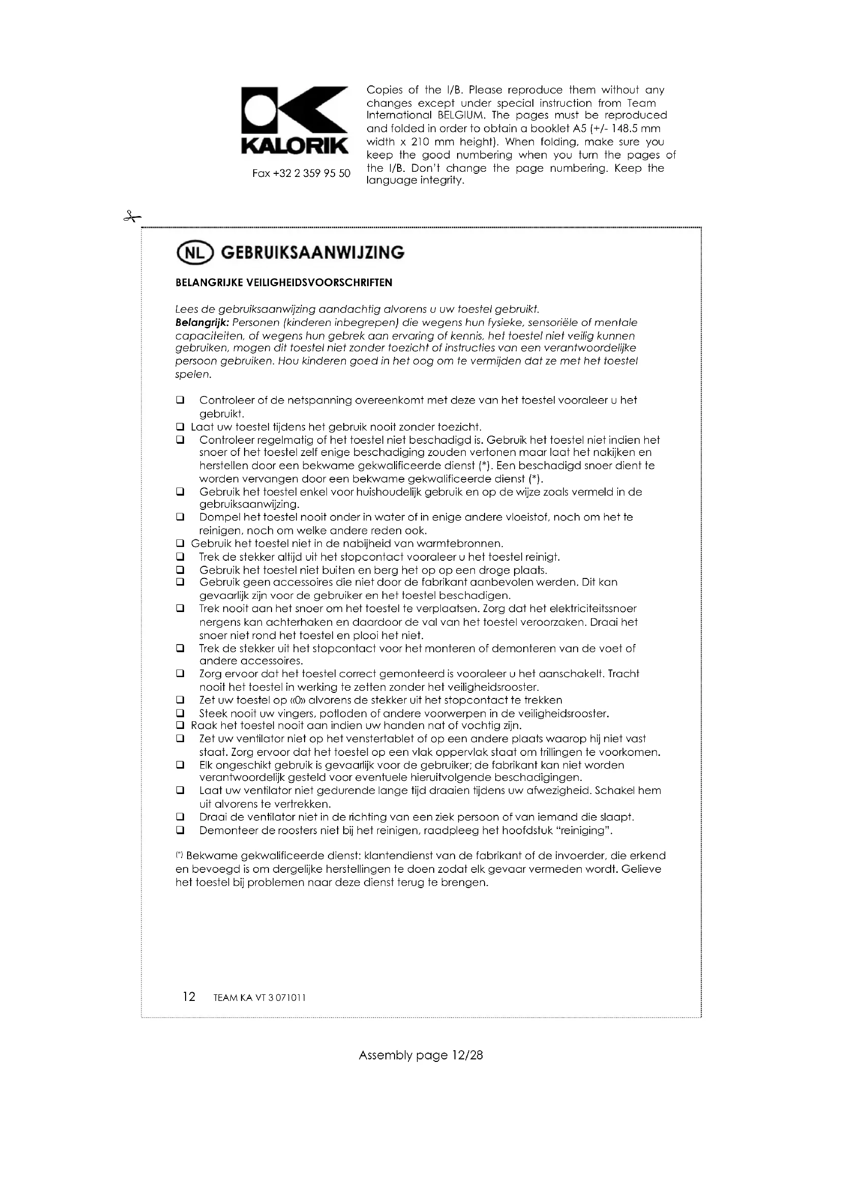 Voor continu gebruik, plaats de tijdschakelaar (6) op AAN (ON). Wanneer de tijdschakelaar (6) op uit-stand is, werkt het toestel niet, zelfs wanneer één van de snelheidsknoppen ingedrukt is. PROGRAMMERING Uw toestel is met een programmeringfunctie uitgerust. Om de werkingsduur (van 0 tot 120 minuten) te programmeren, draai de tijdschakelaar (6) met de klok mee tot de gewenste duur (bv. 80 betekent dat uw toestel gedurende 80 minuten zal werken). Wanneer de knop op de UIT positie komt, zal uw toestel zich automatisch uitschakelen. OSCILLATIE U kunt de oscillatie van de romp van het toestel aanschakelen door op de oscillatieknop (8) te drukken. Dit systeem maakt het mogelijk de luchtstroom over de hele kamer te verspreiden om een zo groot mogelijk volume te beluchten. Wanneer de oscillatie uitgeschakeld is, kunt u de blaasrichting echter ook met de hand regelen door de romp gewoonweg in de gewenste richting te plaatsen. U hoeft daarvoor niet de voet van het toestel te verplaatsen. REINIGING Haal eerst de stekker uit het stopcontact vooraleer het toestel reinigt. Gebruik een vochtige doek om de plastic onderdelen te reinigen. Gebruik nooit schuurmiddelen daar deze het toestel zouden kunnen beschadigen. Gebruik een stofzuiger om het stof te verwijderen zonder het uit elkaar te moeten halen. De ventilator nooit in water of enige andere vloeistof onderdompelen. Copies of the I/B. Please reproduce them without any changes except under special instruction from Team International BELGIUM. The pages must be reproduced and folded in order to obtain a booklet A5 (+/- 148.5 mm width x 210 mm height). When folding, make sure you keep the good numbering when you turn the pages of the I/B. Don’t change the page numbering. Keep the language integrity.