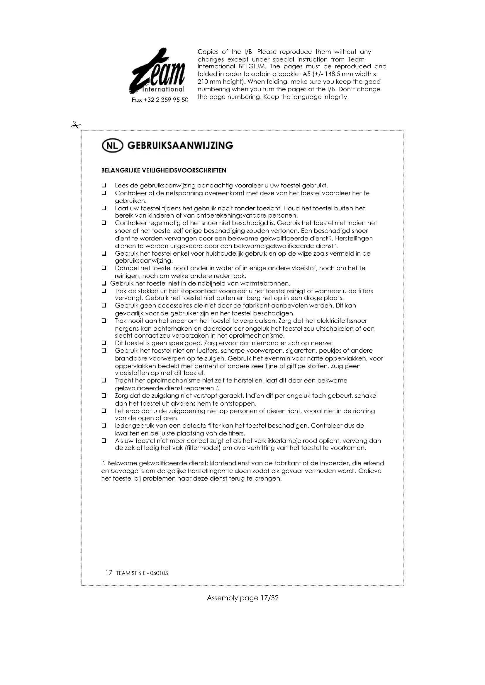 Om ons milieu en onze gezondheid te beschermen, moet afgedankte elektrische en elektronische apparatuur in overeenstemming met welbepaalde regels weggegooid worden. Dit vergt zowel de inzet van de leveranciers als van de gebruikers. Om deze reden mag uw apparaat, zoals op het typeplaatje aangegeven door het symbool , niet met het gewone huisvuil weggegooid worden, maar moet het ofwel naar de verkoper teruggestuurd worden, ofwel naar een centrum van gescheiden inzameling waar het hergebruikt, gerecycleerd of voor andere doeleinden gebruikt zal worden. Copies of the I/B. Please reproduce them without any changes except under special instruction from Team International BELGIUM. The pages must be reproduced and folded in order to obtain a booklet A5 (+/- 148.5 mm width x 210 mm height). When folding, make sure you keep the good numbering when you turn the pages of the I/B. Don’t change the page numbering. Keep the language integrity.
