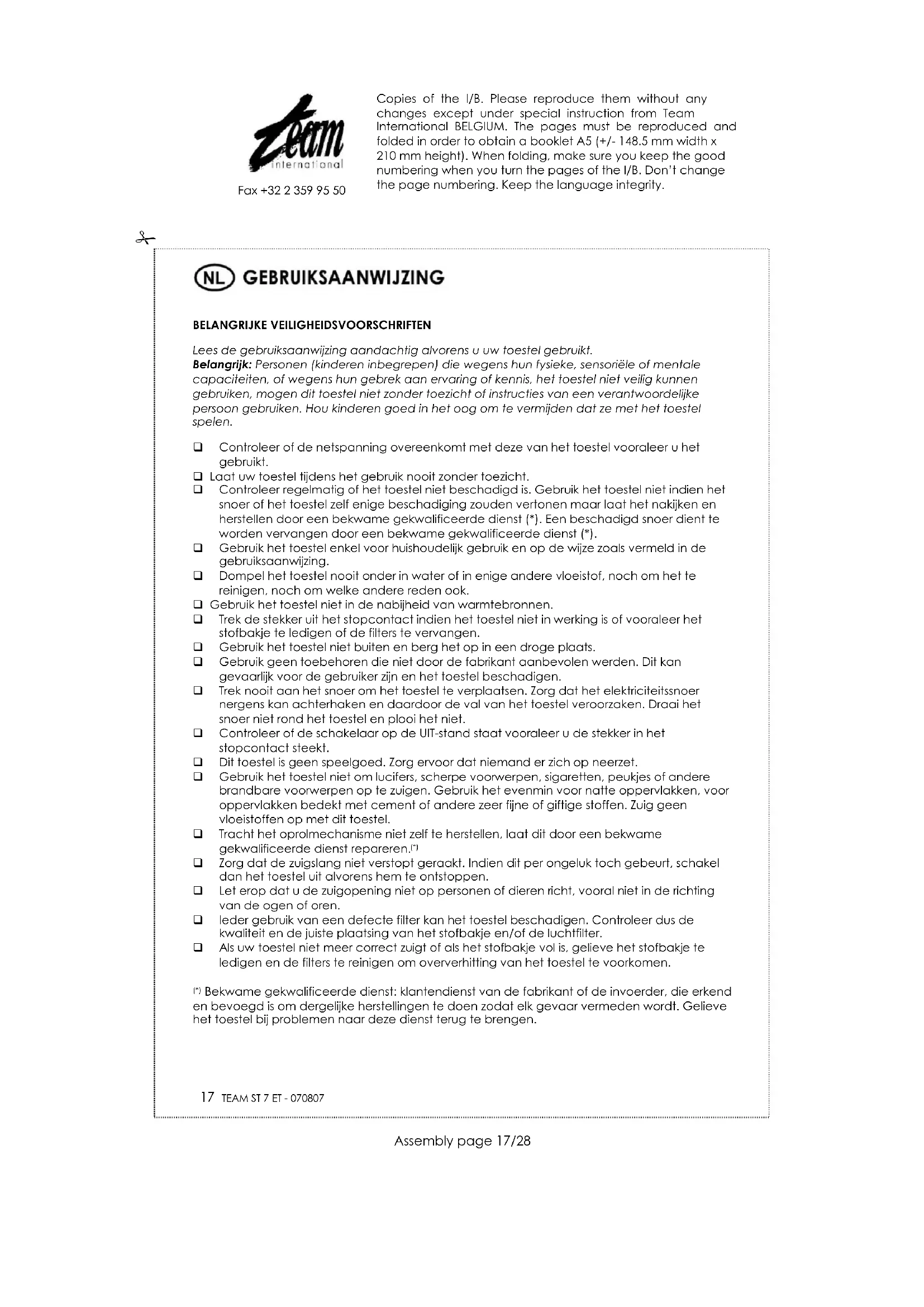 Beschermingsfilter voor de motor Deze filter bevindt zich aan de ingang van de motor onder het deksel van het toestel, achter het stofbakje. Om deze beschermingsfilter te reinigen (ongeveer alle 3 maanden) dient u hem uit het toestel te verwijderen en in een zeepsop onder te dompelen. Luchtfilter Reinig van tijd tot tijd ook de luchtfilter die zich aan de achterkant van het toestel bevindt. Open daartoe het roostertje en neem de filter eruit, reinig hem en plaats hem terug in het toestel en sluit het roostertje. Zorg er wel altijd voor dat de filter volledig droog is vooraleer u hem weer in het toestel plaatst. OPMERKING: Na een bepaald aantal reinigingen zullen de filters beschadigd zijn of zullen ze niet meer hun oorspronkelijke vorm aannemen. In dit geval, gelieve contact op te nemen met de dichtstbijzijnde klantendienst om u nieuwe filters aan te schaffen. Copies of the I/B. Please reproduce them without any changes except under special instruction from Team International BELGIUM. The pages must be reproduced and folded in order to obtain a booklet A5 (+/- 148.5 mm width x 210 mm height). When folding, make sure you keep the good numbering when you turn the pages of the I/B. Don’t change the page numbering. Keep the language integrity.