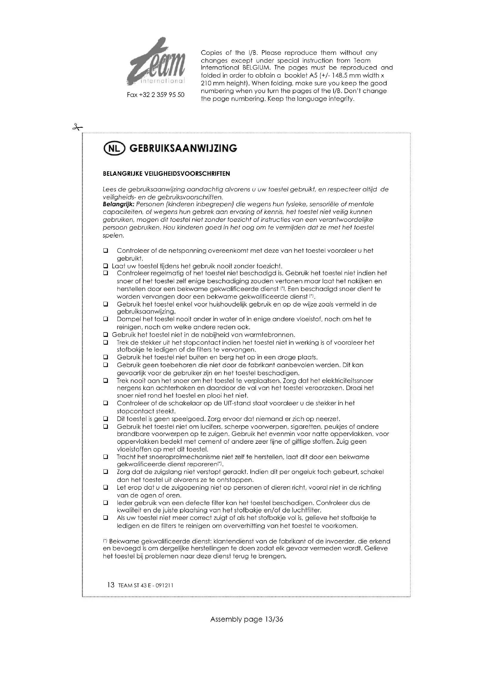 Om ons milieu en onze gezondheid te beschermen, moet afgedankte elektrische en elektronische apparatuur in overeenstemming met welbepaalde regels weggegooid worden. Dit vergt zowel de inzet van de leveranciers als van de gebruikers. Om deze reden mag uw apparaat, zoals op het typeplaatje of op de verpakking aangegeven door het symbool , niet met het gewone huisvuil weggegooid worden. De gebruiker heeft het recht het toestel naar een gemeentelijk centrum van gescheiden inzameling te brengen waar het overeenkomstig de richtlijn hergebruikt, gerecycleerd of voor andere doeleinden gebruikt zal worden. Copies of the I/B. Please reproduce them without any changes except under special instruction from Team International BELGIUM. The pages must be reproduced and folded in order to obtain a booklet A5 (+/- 148.5 mm width x 210 mm height). When folding, make sure you keep the good numbering when you turn the pages of the I/B. Don’t change the page numbering. Keep the language integrity.