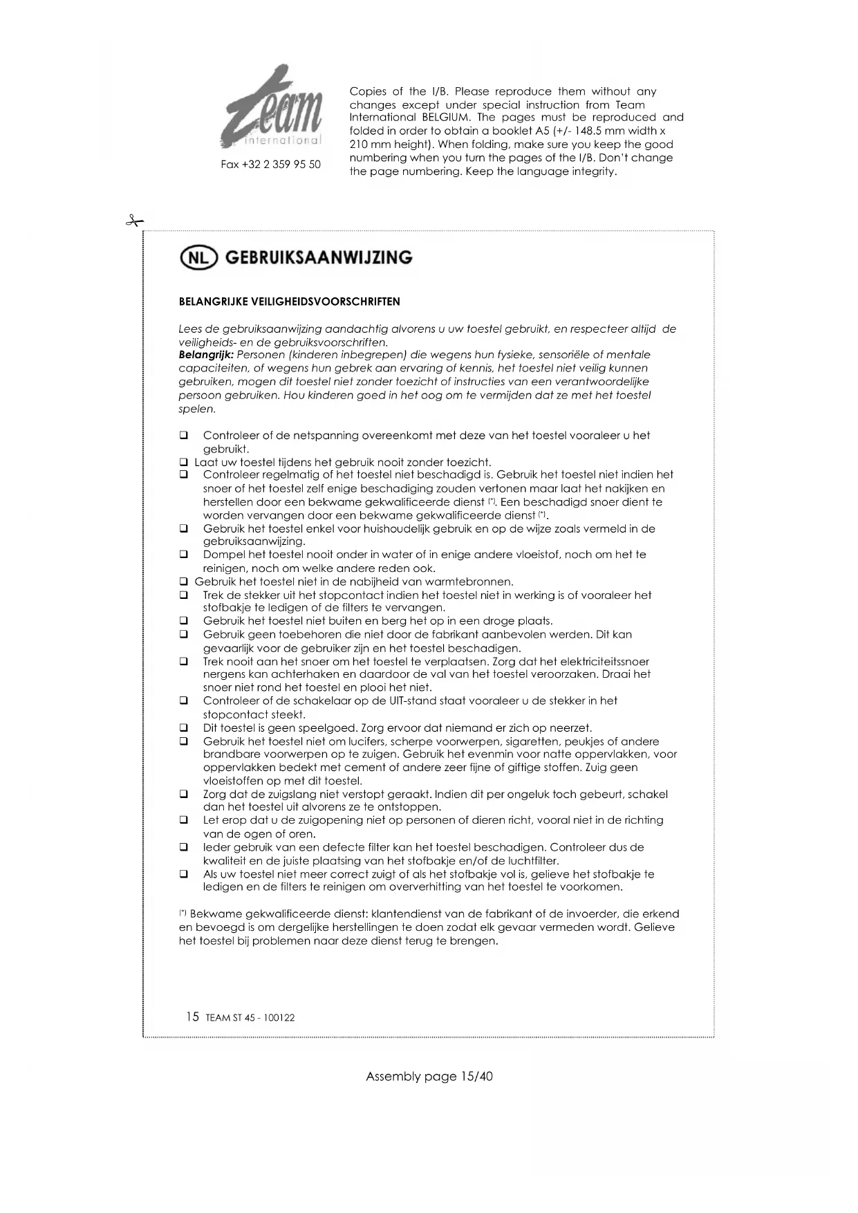 Fax +32 2 359 95 50 naar een gemeentelijk centrum van gescheiden inzameling te brengen waar het overeenkomstig de richtlijn hergebruikt, gerecycleerd of voor andere doeleinden gebruikt zal worden. Copies of the I/B. Please reproduce them without any changes except under special instruction from Team International BELGIUM. The pages must be reproduced and folded in order to obtain a booklet A5 (+/- 148.5 mm width x 210 mm height). When folding, make sure you keep the good numbering when you turn the pages of the I/B. Don‟t change the page numbering. Keep the language integrity.