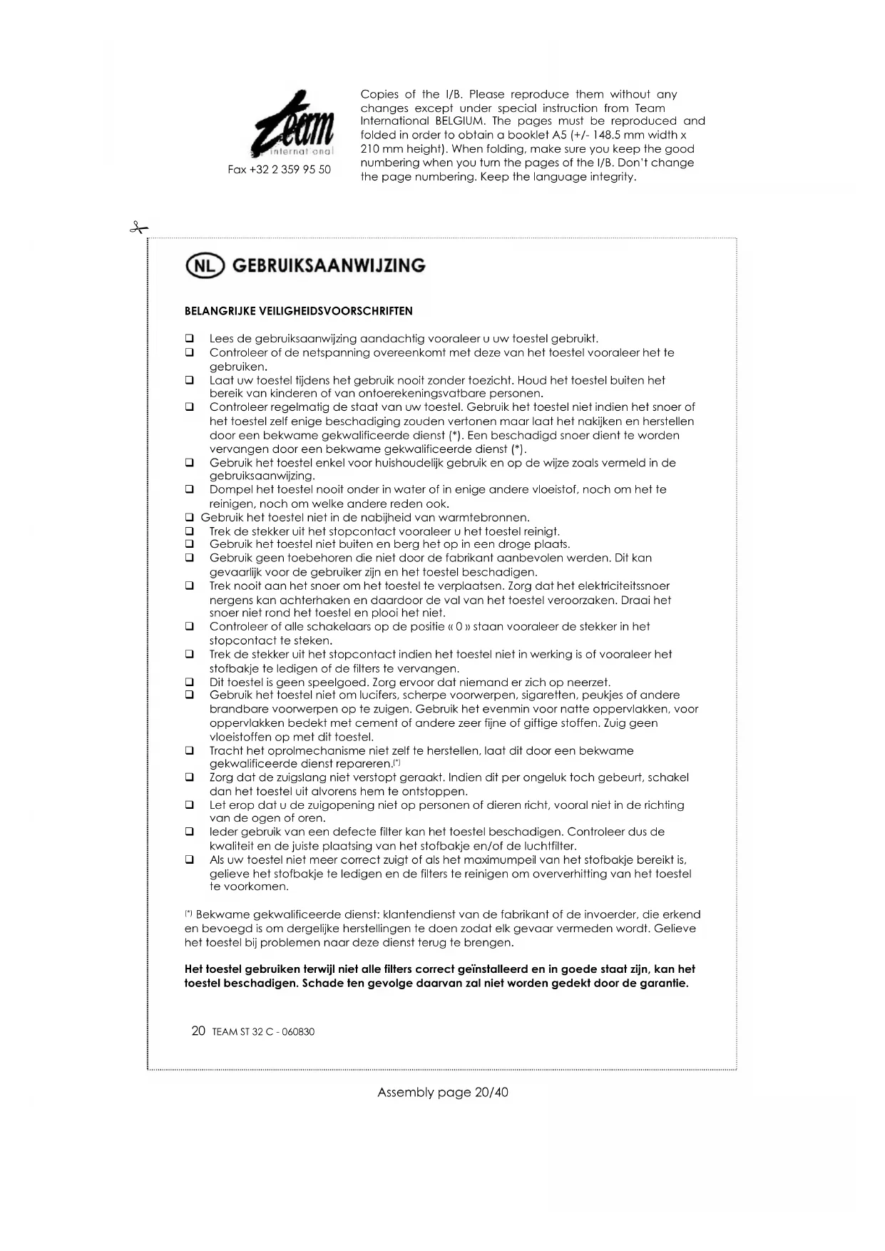 Bekwame gekwalificeerde dienst: klantendienst van de fabrikant of de invoerder, die erkend en bevoegd is om dergelijke herstellingen te doen zodat elk gevaar vermeden wordt. Gelieve het toestel bij problemen naar deze dienst terug te brengen. Het toestel gebruiken terwijl niet alle filters correct geïnstalleerd en in goede staat zijn, kan het toestel beschadigen. Schade ten gevolge daarvan zal niet worden gedekt door de garantie. Copies of the I/B. Please reproduce them without any changes except under special instruction from Team International BELGIUM. The pages must be reproduced and folded in order to obtain a booklet A5 (+/- 148.5 mm width x 210 mm height). When folding, make sure you keep the good numbering when you turn the pages of the I/B. Don‟t change the page numbering. Keep the language integrity.