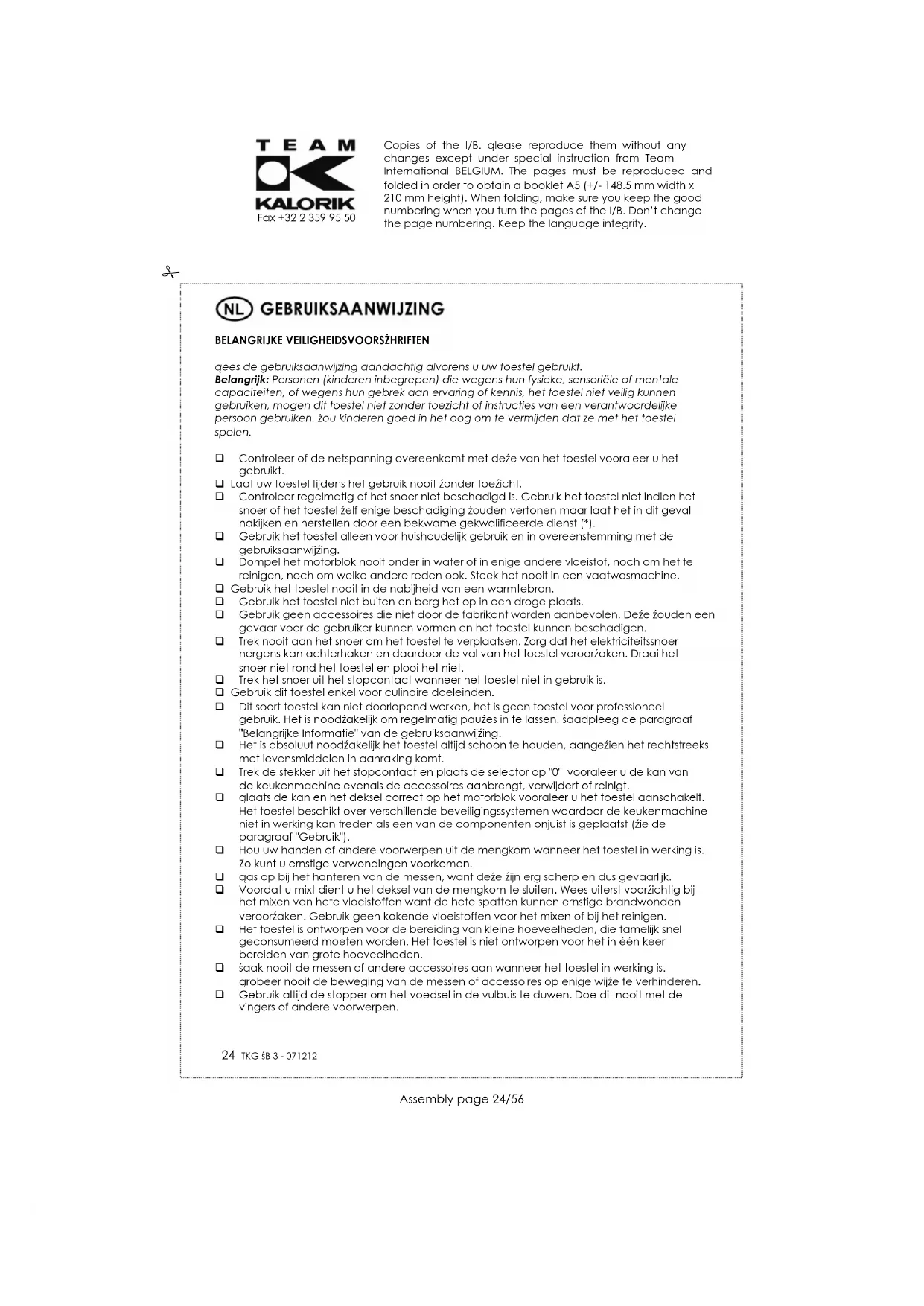 Fax +32 2 359 95 50 Blokkeer nooit de veiligheidsinrichting van het toestel. De kan van de keukenmachine kan eenvoudig onder stromend water gereinigd worden. Pas altijd op voor de messen waar u zich aan kan verwonden. Pas op voor snijwonden bij het hanteren, verwijderen en reinigen of ledigen van de kan.
