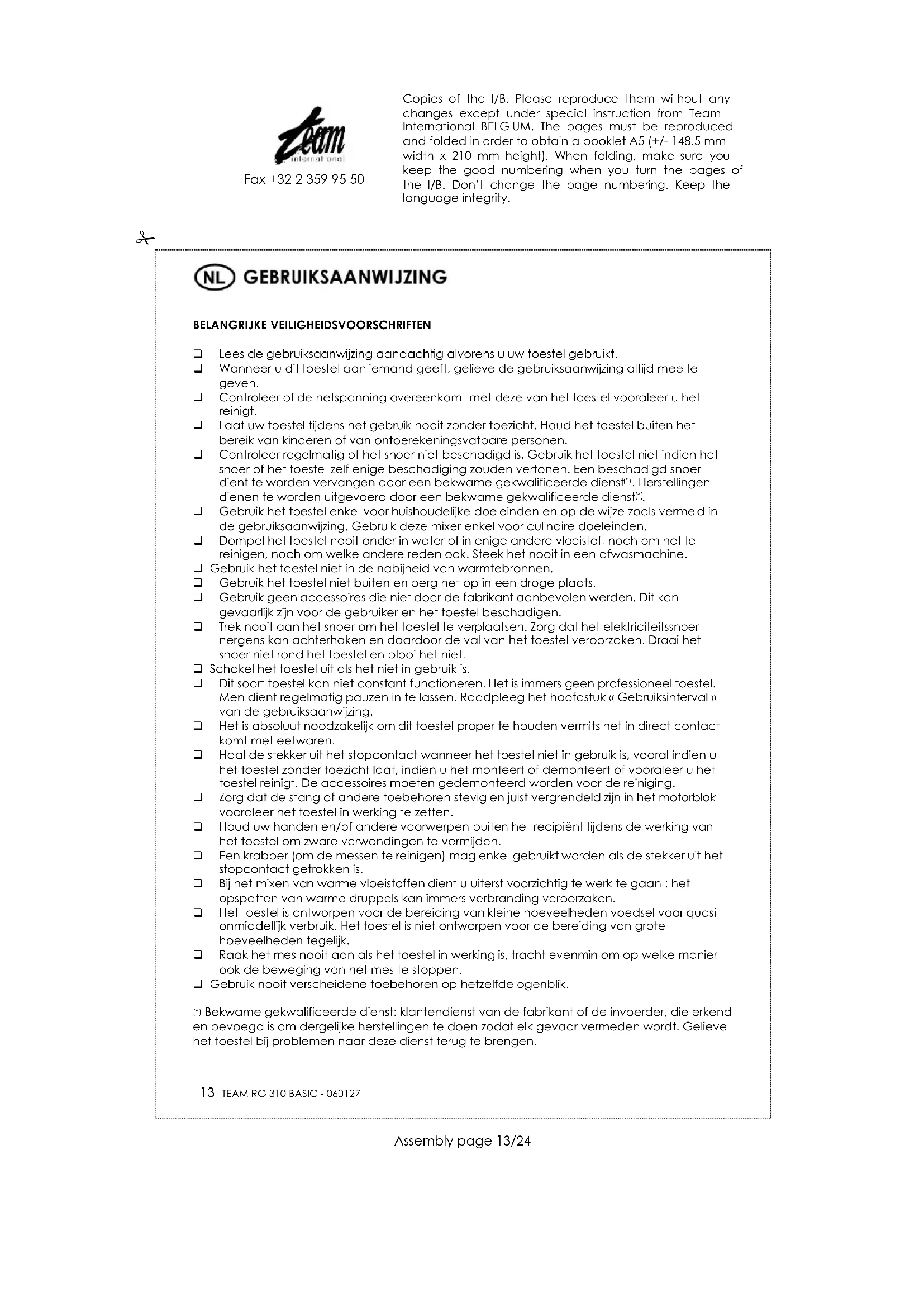 Om ons milieu en onze gezondheid te beschermen, moet afgedankte elektrische en elektronische apparatuur in overeenstemming met welbepaalde regels weggegooid worden. Dit vergt zowel de inzet van de leveranciers als van de gebruikers. Om deze reden mag uw apparaat, zoals op het typeplaatje of op de verpakking aangegeven door het symbool , niet met het gewone huisvuil weggegooid worden. De gebruiker heeft het recht het toestel gratis naar een gemeentelijk centrum van gescheiden inzameling te brengen waar het overeenkomstig de richtlijn hergebruikt, gerecycleerd of voor andere doeleinden gebruikt zal worden. Copies of the I/B. Please reproduce them without any changes except under special instruction from Team International BELGIUM. The pages must be reproduced and folded in order to obtain a booklet A5 (+/- 148.5 mm width x 210 mm height). When folding, make sure you keep the good numbering when you turn the pages of the I/B. Don’t change the page numbering. Keep the language integrity.